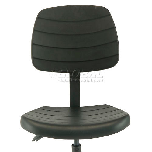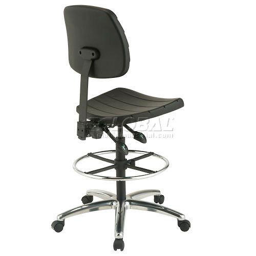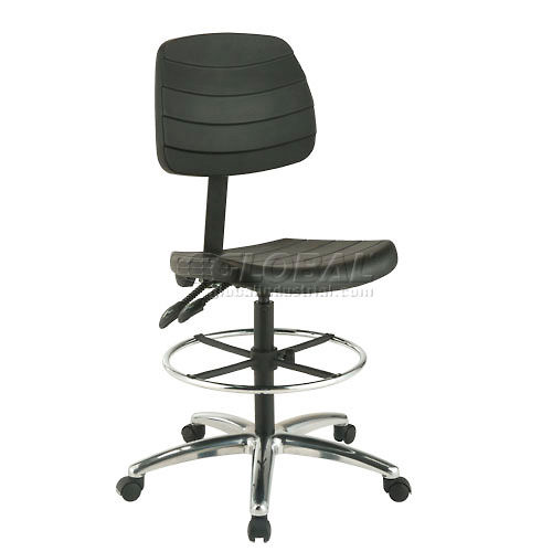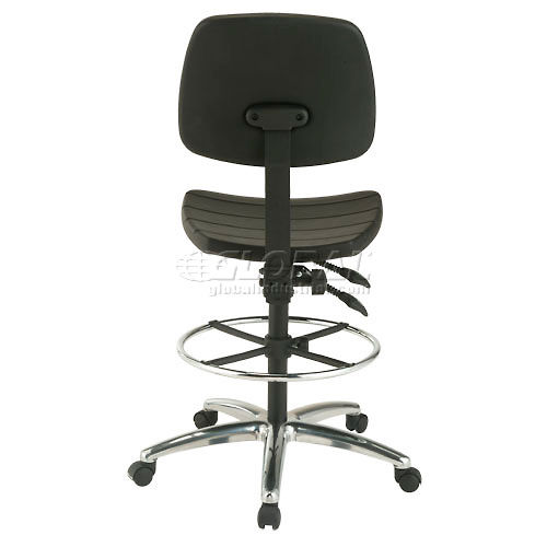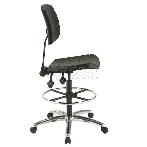 Interion Deluxe 5 Way Adjustable Polyurethane Stool The Most Comfortable Shop Stool Available. This Adjustable Work Stool from Interion By Global Industrial Offers Comfort and Ergonomic Support You Won't Find Anywhere Else This Deluxe Polyurethane Stool is ergonomically designed and engineered to provide proper work posture that improves productivity and helps reduce fatigue. Our easy-to-clean, washable self-skinned polyurethane shop stool resists chemicals and lubricants making it ideal for lab, warehouse and workshop environments. The ribbed seat and back of this industrial polyurethane stool provides comfort and support for extended sitting periods. High density foam core and seat plate reinforcement offer wear and puncture resistance to ensure long life of this work bench stool. Ribbed back is contoured for lumbar support. Features large seat and back; Seat measures 20"W x 18"D x 2" thick. Back measures 17-3/4"W x 13-1/2"H x 1-1/2" thick. Waterfall edge seat helps improve leg circulation. Extra large 26" diameter polished aluminum 5-blade base. This swivel stool includes a 20" diameter chrome foot ring that is height adjustable. 23" - 28" pneumatic seat height adjustment. Other ergonomic support featured on this adjustable shop stool includes back angle and back height adjustment. Includes both swivel casters for easy mobility and non-marring floor glides for stationary positioning. Easy assembly. 1 Year Limited Warranty.