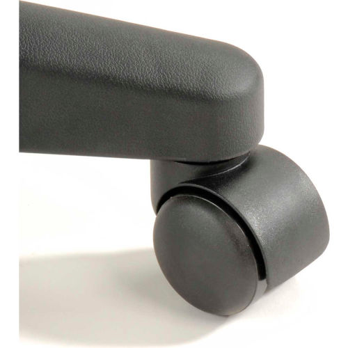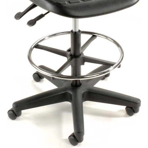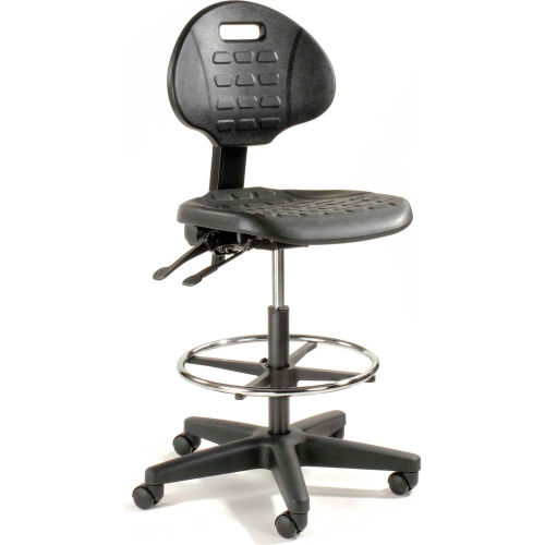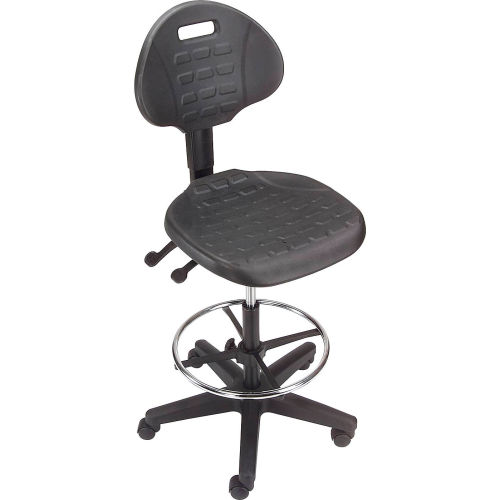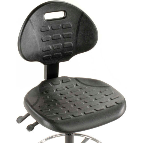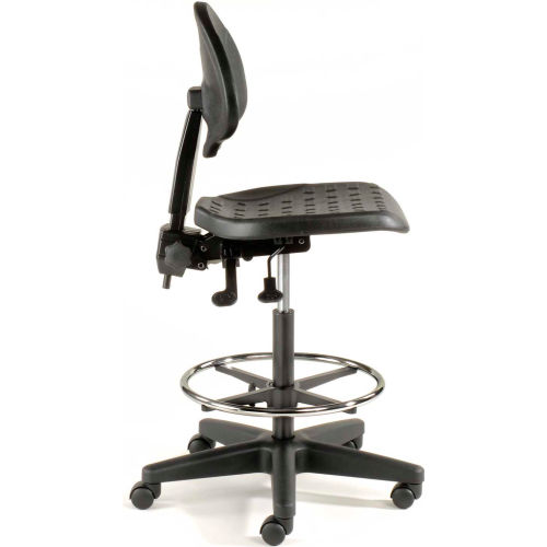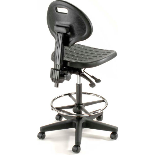 Ergonomic Stool, 5 Way Adjustment, Black , Polyurethane Ideal for extended sitting periods, this adjustable stool helps fight fatigue with 5 ergonomic adjustments and a contoured seat and back. The upholstery of this swivel stool is made with puncture and wear resistant self skinned polyurethane that is easy to clean. The seat features a plate reinforcement that helps this shop chair withstand heavy duty use in tough working environments. The seat also has a waterfall edge to help blood circulation to the legs. Ergonomic adjustments of this work stool include independent seat and back tilt adjustment, 38" to 48-1/2" back height adjustment, 22" to 32-1/2" pneumatic seat height adjustment and 2" back depth range adjustment. This shop stool includes a 360 degree chrome foot ring that is height adjustable. Seat measures 18-1/2"W x 18"D. Back measures 16-1/2"W x 13"H. Stable 5 blade base includes both casters for mobility and glides for stationary use. Easy Assembly. 1 Year Limited Warranty.