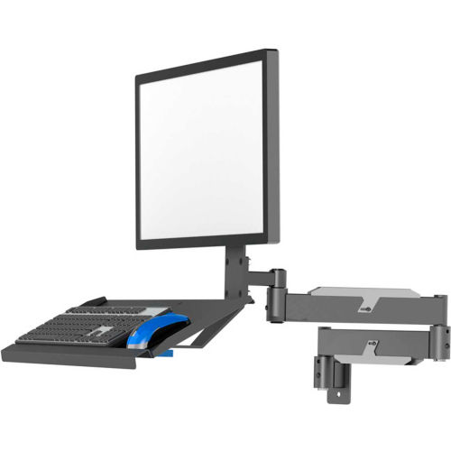 This industry tough arm mount offers a wide range of fold in / fold out horizontal positioning capabilities for your computer monitor and keyboard. A compact, integrated design allows both the monitor and keyboard to be positioned in unison while a full range of monitor and keyboard angle adjustment allows each user to dial in that perfect ergonomic position. Features: Built rugged tough for industrial environmentsUnit folds up compactly when not in useFull range of monitor and keyboard angle adjustmentMonitor height and keyboard depth adjustable for an expanded or more compact set upIncluded cable covers route and conceal up to two 1/2" diameter cables or tubesAdjustable arm rotation tension prevents driftingPre-Drilled for optional add on lever locks to lock arm rotation.