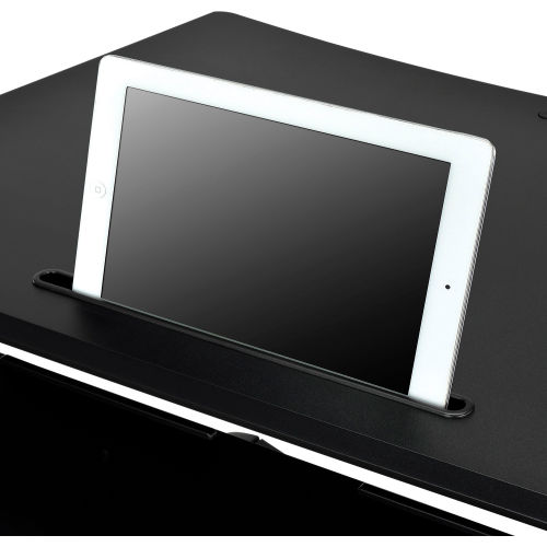 Interion Ergonomic Sit-Stand Desk Converter & Dual Monitor Mount Kit - Full Width Keyboard The Ergonomic Sit-Stand Desk Converter & Dual Monitor Mount Combo Kit from Interion By Global Industrial combines a height adjustable sit stand desk with a monitor desk mount to provide the ultimate in user comfort and productivity, with added savings for buying together. The Interion Height Adjustable Sit-Stand Desk Converter has a 35" wide platform with a full-width removable keyboard tray. The work surface over the keyboard tray can support laptops as well. The Interion 's standing desk converter provides an easy way to transition between sitting and standing throughout the workday. The height adjustable sit-stand desk converter offers smooth up/down motion and the 35"W x 23-1/2"D platform can raise and lower in various increments from 6" to 20" in height. The 34-1/2"W x 11-1/2"D keyboard tray rests close to your desk in the sitting position to maintain ergonomic posture. The platform on the sit-stand desk converter has ample surface area to support two 21" monitors and the gas-lift springs are optimized for the total peripheral weight of 33 lbs. including the keyboard. Convenient tablet stand built into platform. Cable management included. Comes pre-assembled with removable keyboard tray detached. The Interion Dual Monitor Desk Mount pairs seamlessly with the height adjustable sit-stand desk converter to offer ergonomically correct positioning of a dual work display - in both seated and raised positions. The dual monitor desk mount is engineered from aircraft grade aluminum and injection molded plastic for unparalleled durability and smooth adjustments. Each integrated high performance gas lift spring powered arm is optimized for holding a monitor up to 20 lbs. and makes swiveling, tilting and rotating displays easy. The dual monitor desk mount includes a dual USB 3.0 port hub in the base, which are convenient for connecting keyboards, mice, USB flash drives, or for charging and sync with other devices. The 6-ft. USB connection supports connection in the standing position, even when the computer is situated on the floor. Mounting hardware is included for surface mounting through the sit-stand desk converter's pre-drilled grommet hole.
