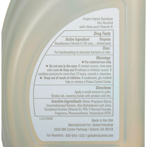 Global Industrial Foam Hand Sanitizer is an effective and convenient way to sanitize hands when soap and water are not available. Formulated with 0.13% Benzalkonium Chloride to eliminate 99.99% of common germs within 15 seconds. Contains Aloe Vera and Vitamin E to moisturize skin. Non-flammable and dye free, with a light linen fragrance. Ideal where a non-alcohol product is desired. The pump bottle design provides flexibility and is portable and disposable. Bottles remain stable when pumping and can also be used with Global Industrial Wall Mount Bracket (sold separately) to convert into a wall mounted dispensing system. oz. pump bottle. Sold 8 bottles per case.