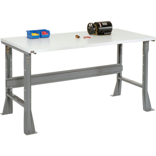 This workbench protects equipment from harmful static. This workbench comes with a 1-1/4" thick conductive white plastic top. It is ideal for controlling static electricity. It prevents damage to sensitive electronic circuitry during assembly. The properly grounded work surface rapidly bleeds off static build-up and prevents damage to sensitive electronic circuitry during assembly. It dissipates 5000V static charge in 0.01 sec with surface resistance of 10 10 . This workbench is easy to clean with soap and water. Static dissipation complies with MIL-B81705B and 101B, 101C, Method 4046. The steel parts are finished with scratch-resistant gray powder coat. The bench stringer comes with mounting hardware to assemble legs to the benchtop.