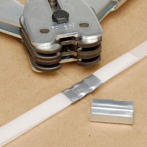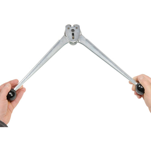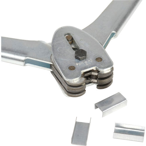 This crimping tool features a double down notch for steel strapping. It can strap materials up to 5/8". The crimper is designed for use with heavy duty steel.