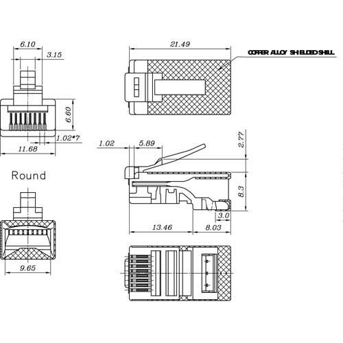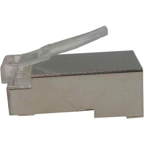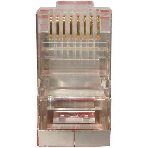 Vertical Cable, 011-017-100, Cat 5E, RJ45 Shielded Modular Plugs, 8P 8C, 50 Micro-Inches Gold Plated, 100/Pack 50 Micro-Inches Gold Plated 3 prong For Shielded Solid Cable 24AWG to 26AWG Cable Shield - Copper Alloy Shell Polycarbonate Housing Transparent 50u" Gold Plating RoHS Compliant.