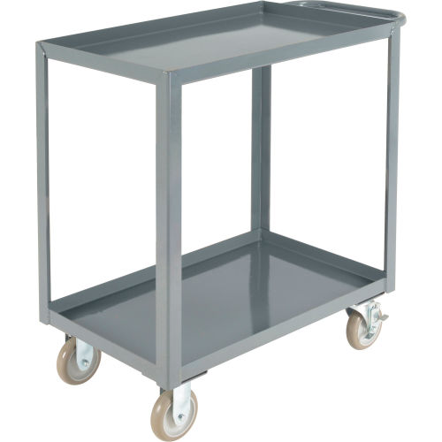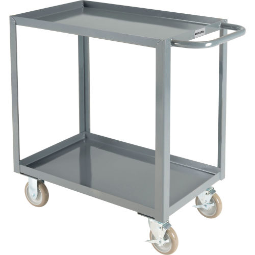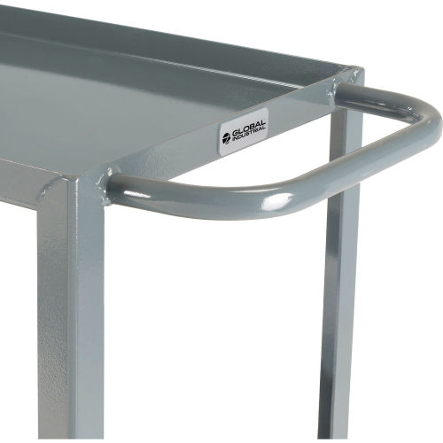 Get inventory rolling faster with better steering and support. This Global Industrial All Welded Service Cart simplifies transportation of heavy equipment and materials throughout your facility. Heavy-duty 12 gauge shelves and 10 gauge corner posts each have a durable gray powder coated finish. Tray shelves have a 1-1/2" retaining lip that prevents items from sliding out and allows loading/unloading of heavy objects with ease. The push/pull steel handle provides an additional 5" to the overall length of cart allowing the user to easily grip and steer with comfort. Includes the Global Industrial Non-Marking 5" Polyurethane Caster Kit which includes 2 swivel wheels with brakes and 2 rigid wheels designed to easily bolt onto carts. Withstands a overall load capacity for strength and rigidity in any application. The cart is all welded and ships assembled. Made in the USA. 1 Year Limited Warranty.