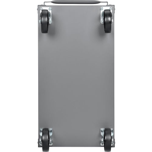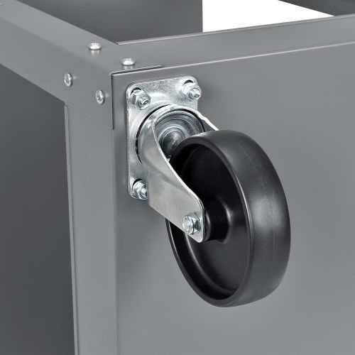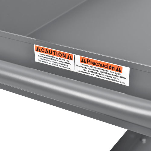 Heavy duty steel angle uprights and machine rolled tray edges offer superior strength and rigidity. 500lb capacity cart has 12 gauge steel legs with 3-1/2" deep 20-gauge trays. Reversible top trays offer a flat shelf alternative to ease load or unload of bulky items. Steers easily with a formed steel tubular handle and 5" polypropylene casters(2-swivel and 2-rigid). Durable powder coat finish. Easy assembly.