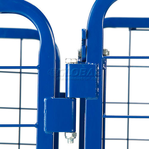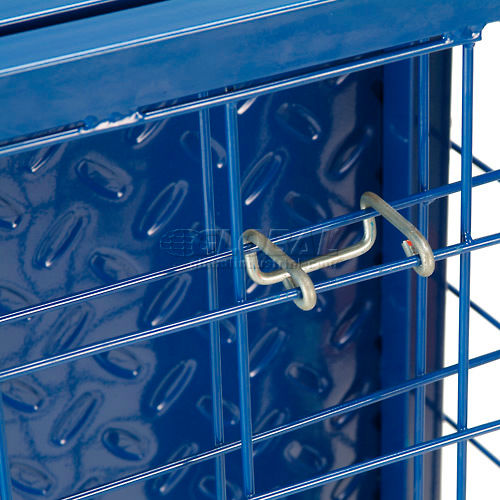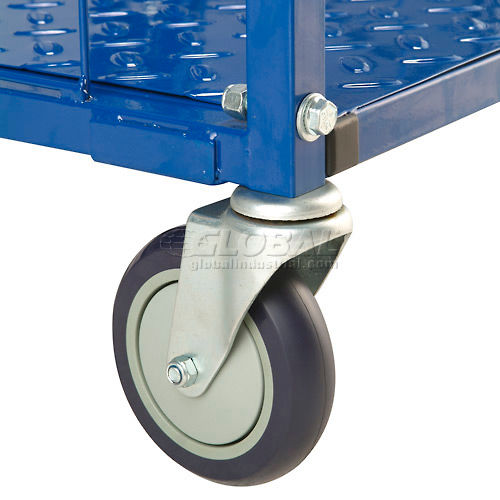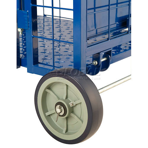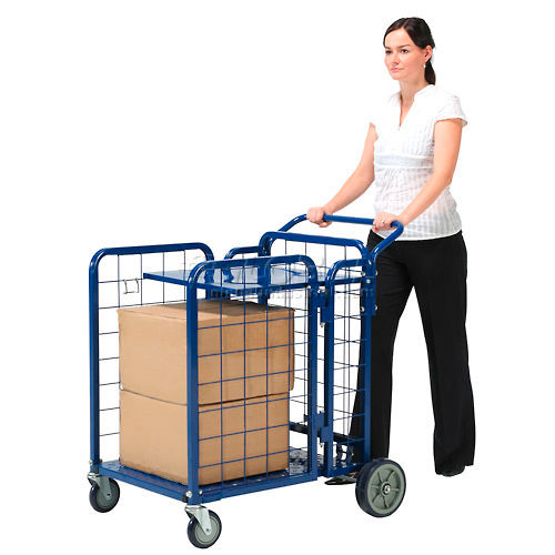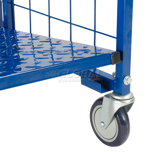 Fold-A-Way Steel Stock Cart Lb. Capacity - 242026 Heavy-duty stock cart offers easy transport and removal of contents. High side walls contain cargo. Folds easily to 18" deep for compact storage. Convenient latch holds cart in folded position. Durable 14 gauge steel construction with 1" tubular frame and handle. Open wire 3 " x 3 " grid allows visibility to contents. Folding, smooth top shelf folds to provide additional storage space. 25" clearance between shelves. Bottom shelf features slip resistant tread plate surface. Features two 5" polyurethane swivel casters and two 8" axle mounted thermoplastic rubber wheels for easy mobility. 38"L x 28"W x 39"H overall with chip resistant blue powder coat finish. Easy assembly.