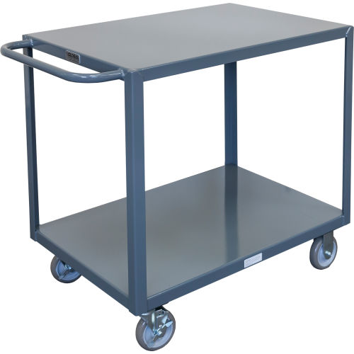 Get inventory rolling faster with better steering and support. This Global Industrial All Welded Service Cart simplifies transportation of heavy equipment and materials throughout your facility. Heavy-duty 12 gauge shelves and 10 gauge corner posts each have a durable gray powder coated finish. The smooth and flat flush shelf design provides a convenient work surface and allows for easy loading/unloading of heavy objects. The push/pull steel handle provides an additional 5" to the overall length of cart allowing the user to easily grip and steer with comfort. Includes the Global Industrial Non-Marking 5" Polyurethane Caster Kit which includes 2 swivel wheels with brakes and 2 rigid wheels designed to easily bolt onto carts. Withstands a overall load capacity for strength and rigidity in any application. The cart is all welded and ships assembled. Made in the USA. 1 Year Limited Warranty.