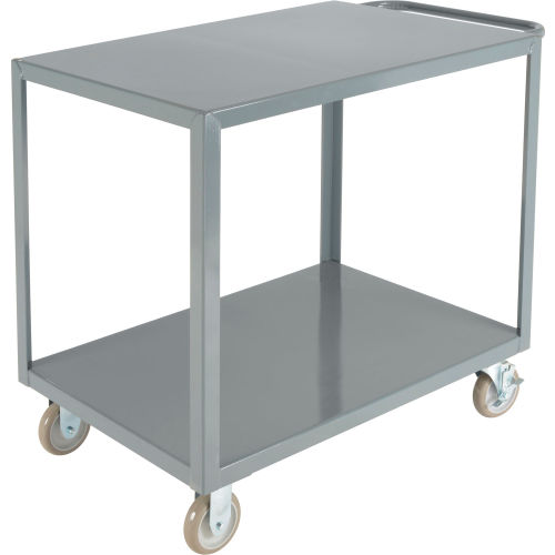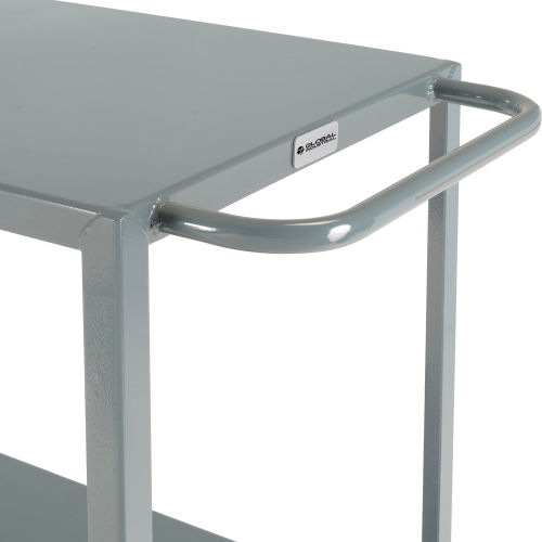 ✓ Load capacity: 1,200 lbs. ✓ Ships assembled ✓ Made in the U.S.A. Get inventory rolling faster with the Global Industrial Steel Utility Cart with 2 Shelves. Constructed with heavy-duty 12-gauge shelves and 10-gauge corner posts, in a sleek gray powder coated finish, this utility cart simplifies transportation of heavy equipment and materials throughout your facility. The smooth and flat flush shelf design provides a convenient work surface and allows for easy loading and unloading of heavy objects. The push and pull steel handle provides an additional 5" to the overall length of cart allowing the user to easily grip and steer with comfort. The cart is all welded and includes the Global Industrial Non-Marking 5" Polyurethane Caster Kit which includes 2 swivel wheels with brakes and 2 rigid wheels designed to easily bolt onto carts. 1-Year Limited Warranty.