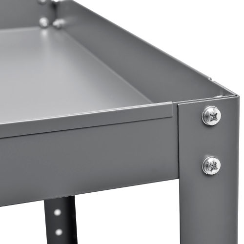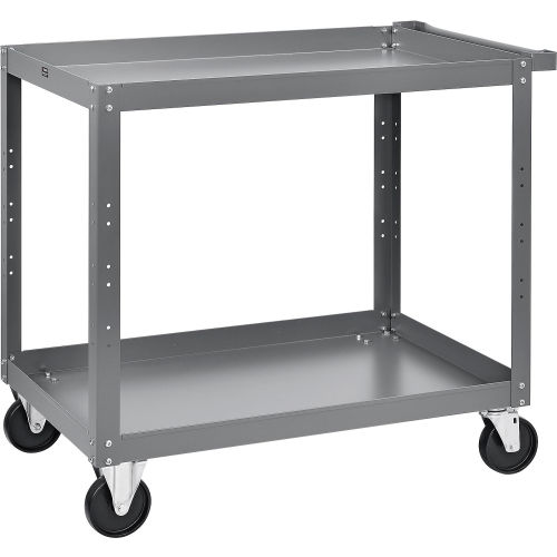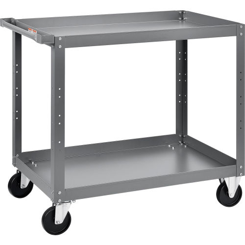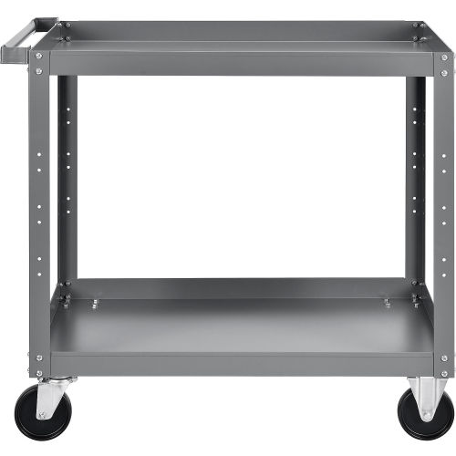 Steel Utility Cart features 16-gauge steel shelves with 2" deep hemmed trays. The bottom shelf tray is fixed, while the other is reversible to offer a flat shelf option. Steel push handle and 5" polypropylene wheels (2 swivel, 2 rigid casters) offer easy maneuverability. 36"H. Durable powder coat finish. Assembles easily.