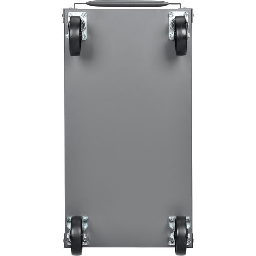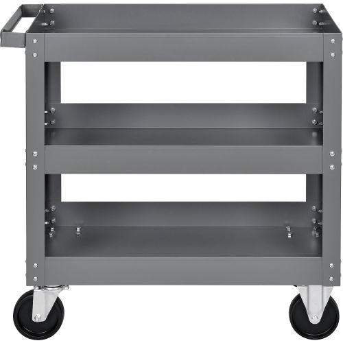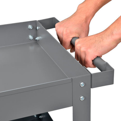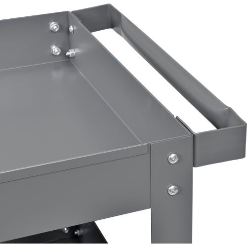 Heavy duty steel angle uprights and machine-rolled tray edges offer superior strength and rigidity. 800lb capacity cart has 12 gauge steel legs with 3" deep 18-gauge trays. Reversible top tray offers a flat shelf alternative to ease load or unload of bulky items. Steers easily with a formed steel tubular handle and 5" polypropylene casters (2 swivel, 2 rigid). Durable powder coat finish. Easy assembly.