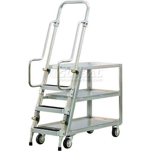 Stock picking carts minimize the risk of injuries when pulling stock orders or restocking shelves. Step ladder cart features a spring-loaded ladder that safely holds the cart in place for safe climbing and loading. Extra-wide steps are welded and bolted in place and feature non-slip tape for added safety. Continuous grip handle features an extended reach bar on the top, and the offset push handle saves your shins when climbing. All welded aluminum construction for years of service; Lifetime Warranty against rust and corrosion. Rolls smoothly with 5" rubber casters (2 swivel, 2 rigid). Ladder Cart with Tray Shelves has shelf lips that help retain cargo when the cart is moved.