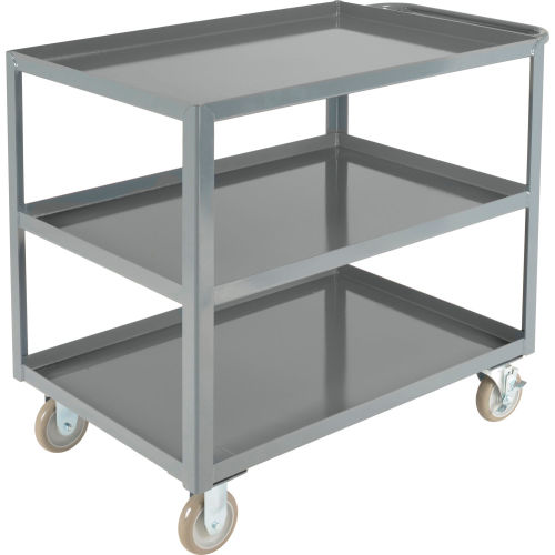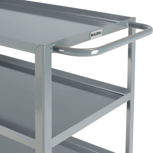 Get inventory rolling faster with better steering and support. This Global Industrial All Welded Service Cart simplifies transportation of heavy equipment and materials throughout your facility. Heavy-duty 12 gauge shelves and 10 gauge corner posts each have a durable gray powder coated finish. Tray shelves have a 1-1/2" retaining lip that prevents items from sliding out and allows loading/unloading of heavy objects with ease. The push/pull steel handle provides an additional 5" to the overall length of cart allowing the user to easily grip and steer with comfort. Includes the Global Industrial Non-Marking 5" Polyurethane Caster Kit which includes 2 swivel wheels with brakes and 2 rigid wheels designed to easily bolt onto carts. Withstands a overall load capacity for strength and rigidity in any application. The cart is all welded and ships assembled. Made in the USA. 1 Year Limited Warranty.
