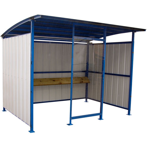 STEEL STORAGE BUILDINGS Steel Smokers Shelter Steel storage buildings are available in varying styles for multiple applications. These outdoor storage shelters provide storage space for equipment, supplies, bikes and more. Sheds are made of durable steel for maximum protection and strength. 18-gauge steel roof is contoured for water drainage. 28-gauge steel siding for added protection. Welded steel frame is powder-coated blue. Includes lag-down plates for secure installation. Shed measures 10 ft wide x 8 ft deep x 9 ft high overall. Steel Smokers Shelter includes a 42"W clear front panel to protect people from wind and the elements. Provides a convenient smokers shelter or bus stop. Includes a wooden lean-back bend rail for user comfort. Easy assembly.
