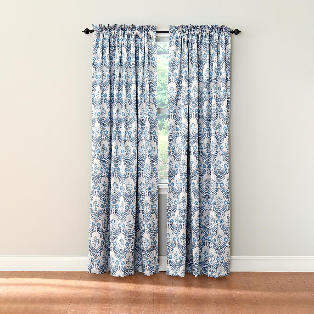 Damask blackout rod pocket curtain panel features a colorful damask print on a blackout fabric. This panel comes in three colors sure to work with your decor. Sizes: 50x63 and 50x84. Shown: Two 84" panels. One panel per package.