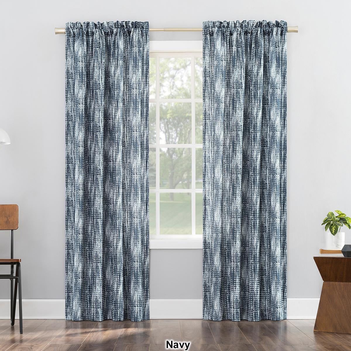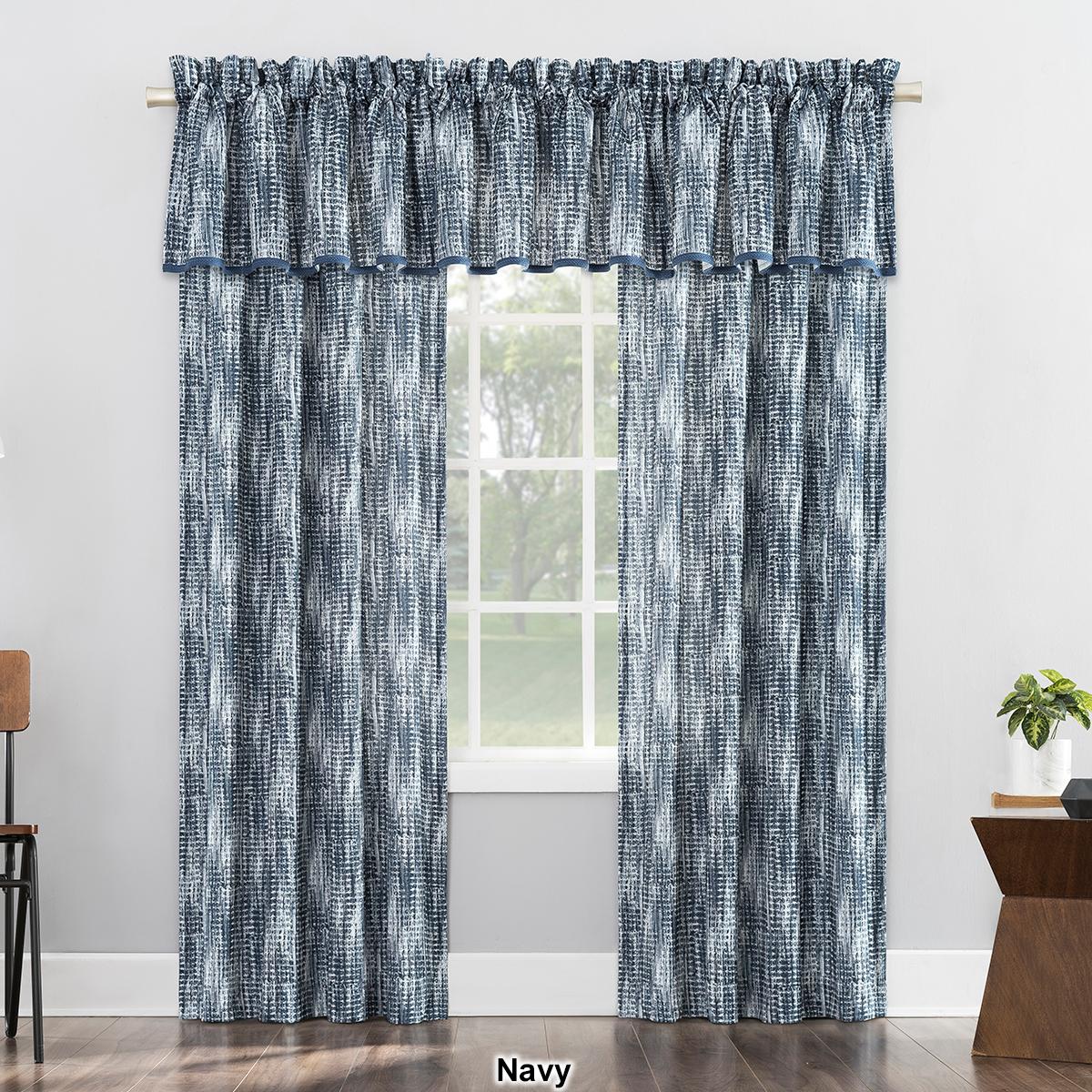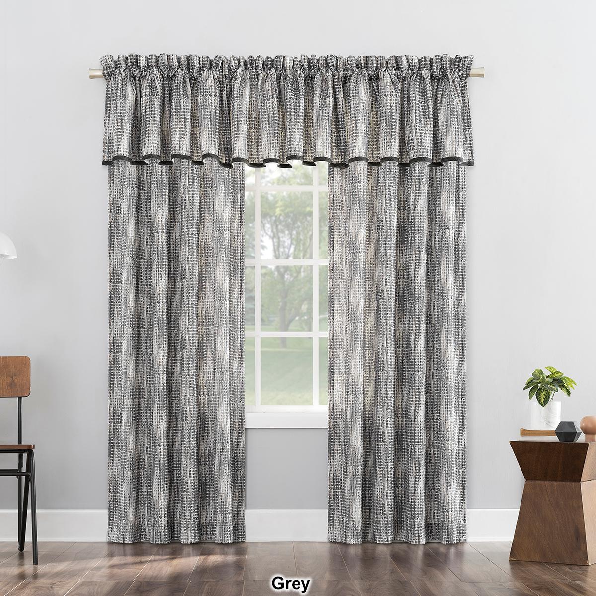 Aran is a sweater-look print on 100% Polyester room darkening printed curtain rod pocket panels. Length: 54x63 and 54x84. Panels have a 2-inch header and a 3-inch bottom hem. The photo shows two panels and two valances, each sold separately which complete the look. Easy care, machine wash cold Gentle cycle Tumble dry low.