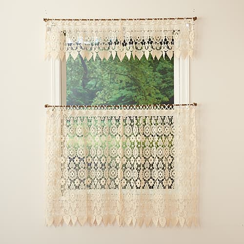 Medallion Macrame kitchen curtains feature a macrame lace with decorative scalloped bottom hem. The tiers offer round macrame loops at the top for hanging. Shown: One valance and one tier. Complete the look with item #19916. Sizes: 35x24 and 35x36.