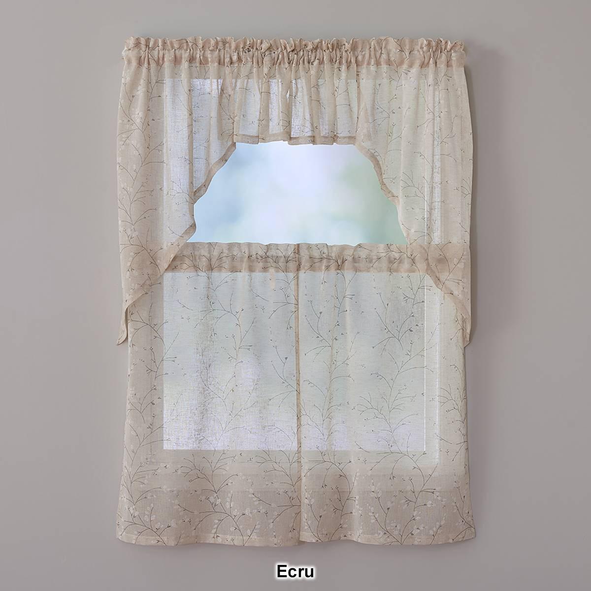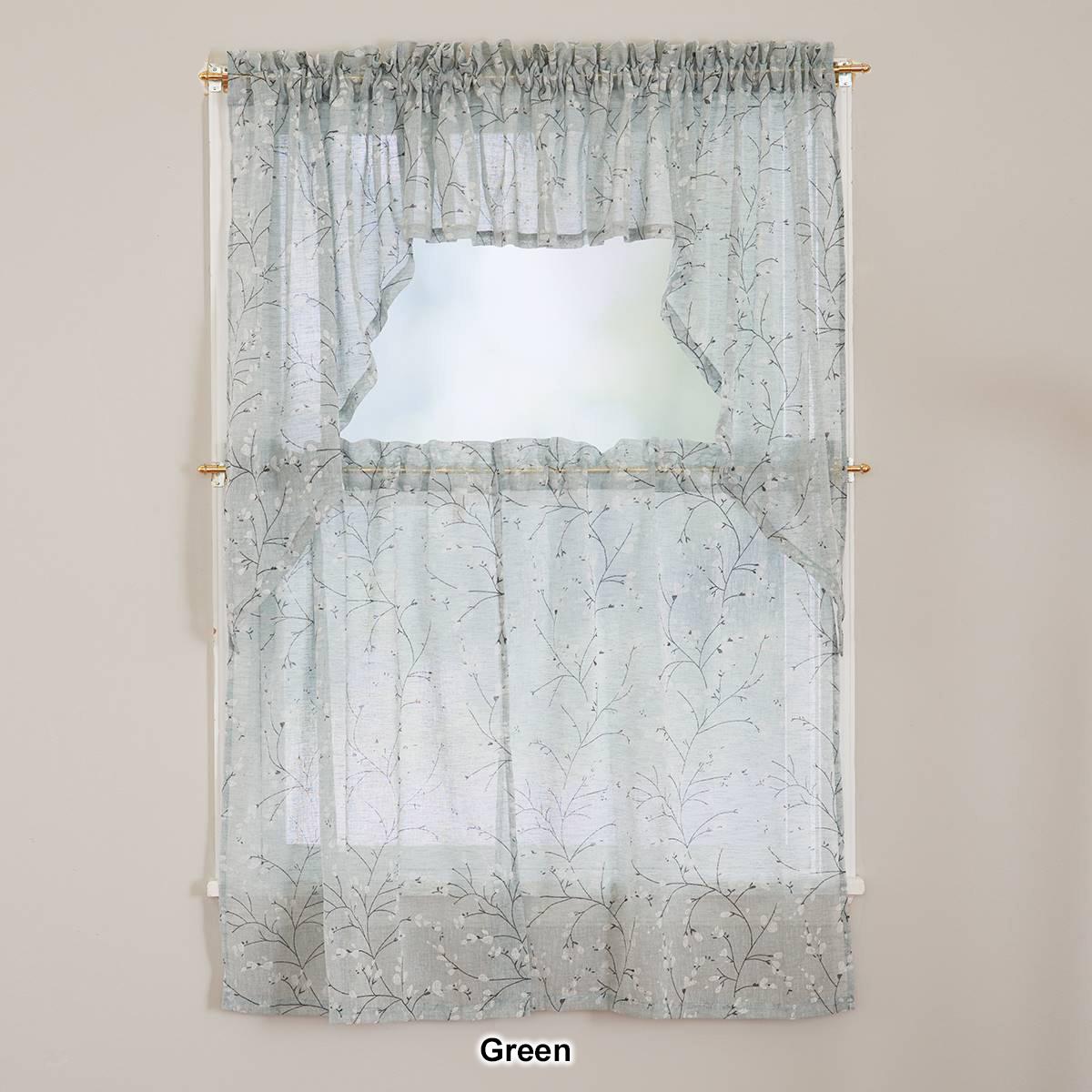 The Willow floral sheer tier kitchen curtain features a printed motif of scrolling branches and blossoms in the process of leafing out to greet the spring. Complete the look with item #4556 and #55430. Sizes: 56x24 and 56x36 Made of opaque textured fabric with a linen look Offers light filtering privacy with an elegant vintage appearance Machine Washable Material: 100% Polyester Shown: tier pair with one valance, one swag pair Tires sold in pairs.