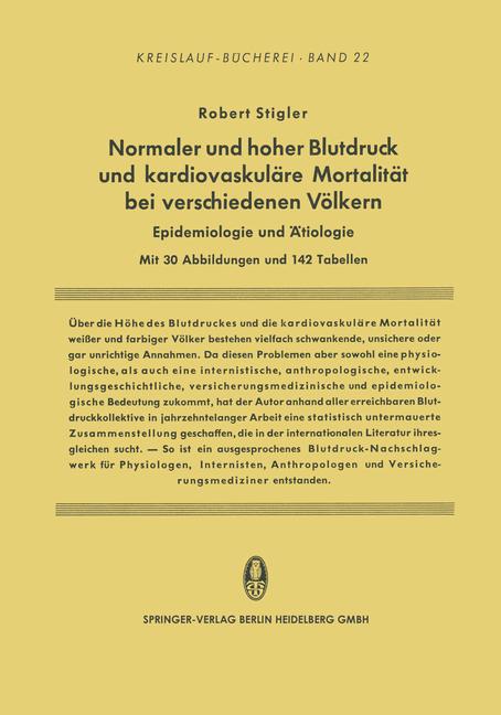 Ich habe die vorliegende Untersuchung schon vor dem II. Weltkrieg begonnen. ber die Hhe des Blutdruckes und die kardiavaskulre Mortalitt verschiedener weier und namentlich farbiger Vlker bestehen schwankende, unsichere und viel fach unrichtige Annahmen. Da diesem Problem eine physiologische, medizinische, anthropologische, entwicklungsgeschichtliche, versicherungsmedizinische und epi demiologische Bedeutung zukommt, so entschlo ich mich zu seiner Bearbeitung, und zwar auf Grund aller erreichbaren Blutdruckkollektive mglichst vieler weier und farbiger Vlker. Da die Literatur hierber groenteils in schwer zugnglichen Organen verschiedener Wissenszweige in aller Welt verstreut ist, so war nicht nur die Auffindung, sondern auch die Beschaffung der einschlgigen Arbeiten sehr umstndlich und sehr oft nur durch Einholung von Sonderdrucken mglich. Mit der Zeit sammelte sich aber doch ein unerwartet reiches Material bei mir an. Mit dem Einlangen neuer wichtiger einschlgiger Publikationen mute das Manu skript mit seinen vielen Tabellen immer wieder ergnzt und umgearbeitet und wegen alsbald eingetretener berschreitung des mir zugebilligten Buchumfanges schlielich mehrmals ausgiebig gekrzt werden. Alle damit verbundenen mhsamen und zeitraubenden Hilfsarbeiten oblagen ausschlielich meiner Frau MARGARETE STIGLER, deren uerst gewissenhafte und verstndnisvolle jahrelange Mitarbeit fr die Vollendung meines Werkes unent behrlich war. Fr die Herausgabe meines Buches spreche ich dem Verlag Dr. DIETRICH STEIN KOPFF in Darmstadt und der Deutschen Forschungsgemeinschaft in Bad Godesberg fr die Gewhrung eines Druckkostenzuschusses meinen wrmsten Dank aus.