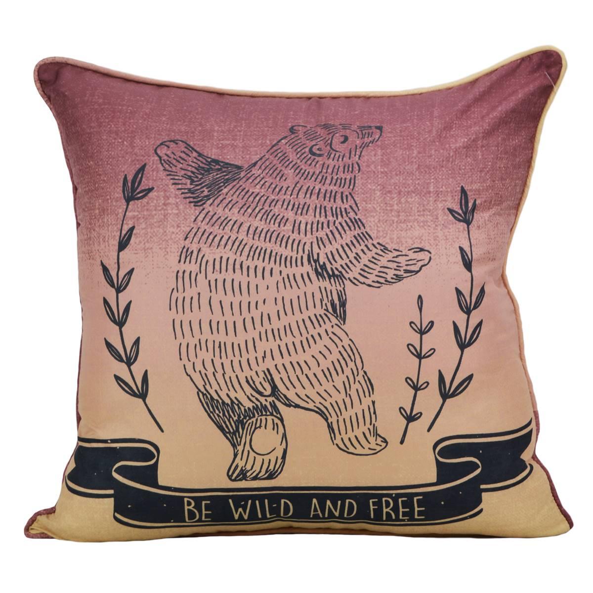 This Donna Sharp Forest Symbols bear decorative pillow features abear walking away, with the words "Be Wild and Free" printed in black.