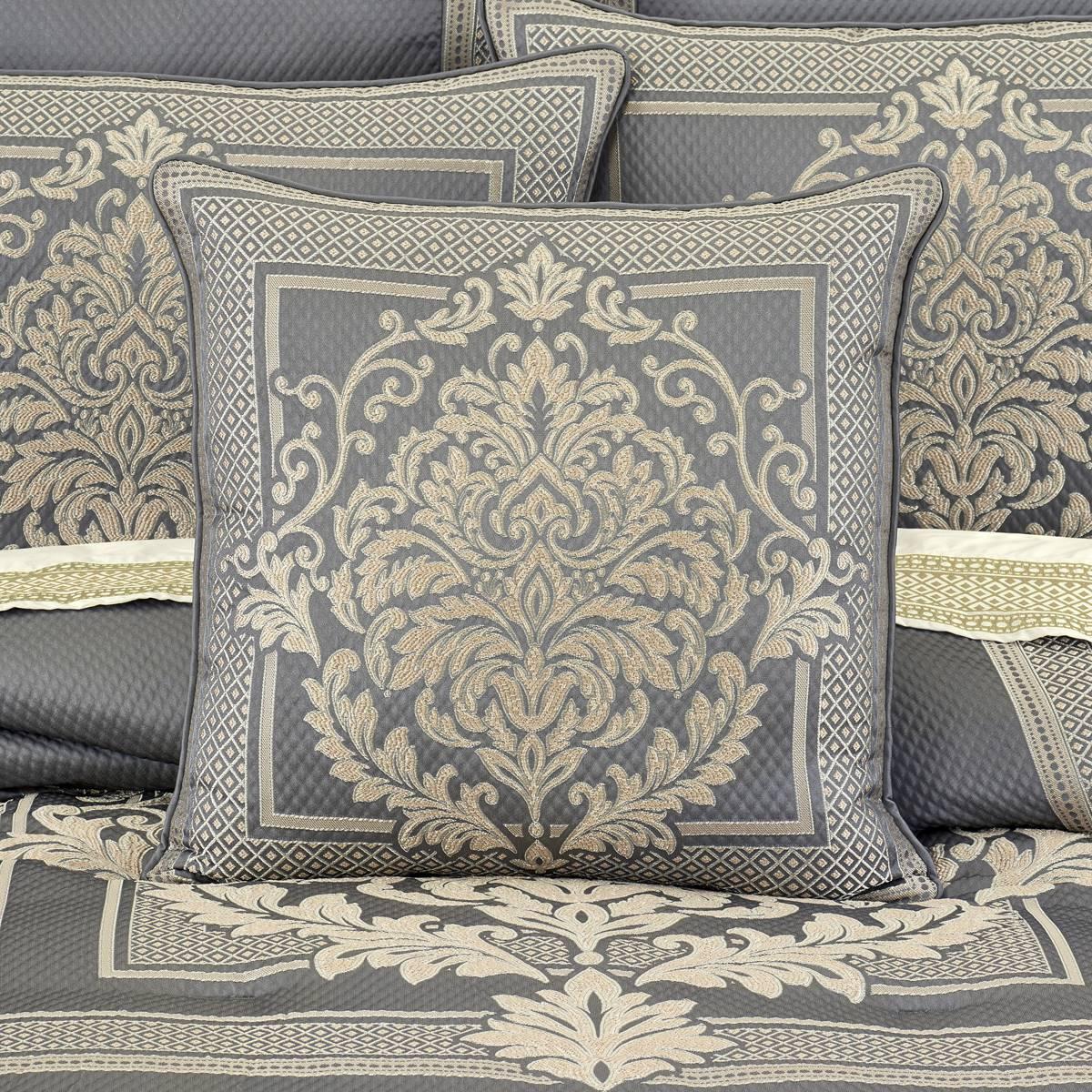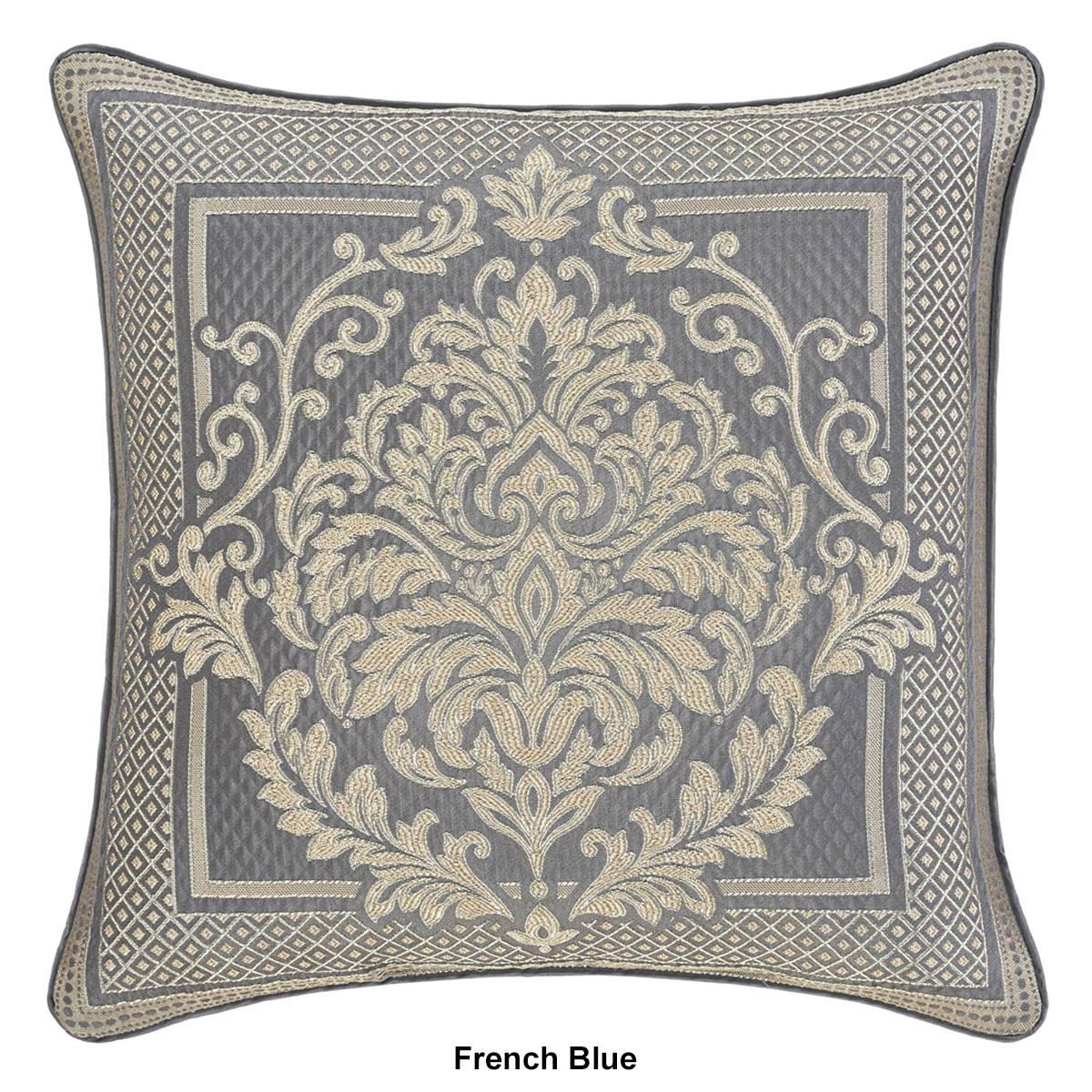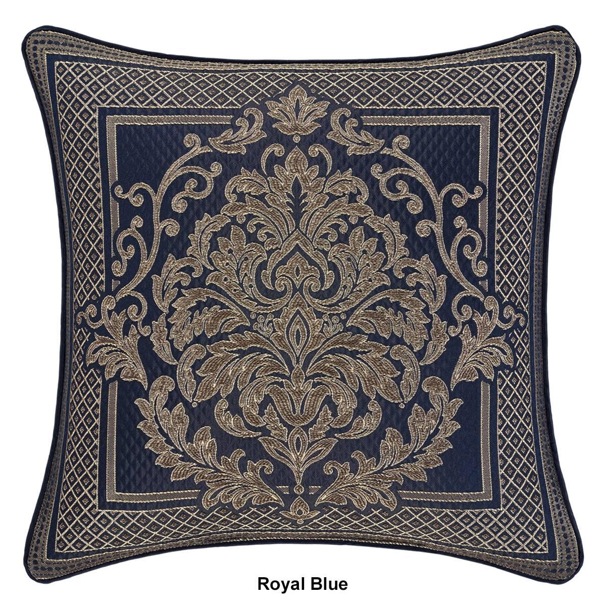 The J. Queen New York Excelsior 20-inch throw pillow features an elegant woven damask design framed with a diamond border in a stunning blue colorway. This lovely accent pillow reverses to a diamond embossed satin for added decor versatility and coordinates with the Excelsior bedding collection.