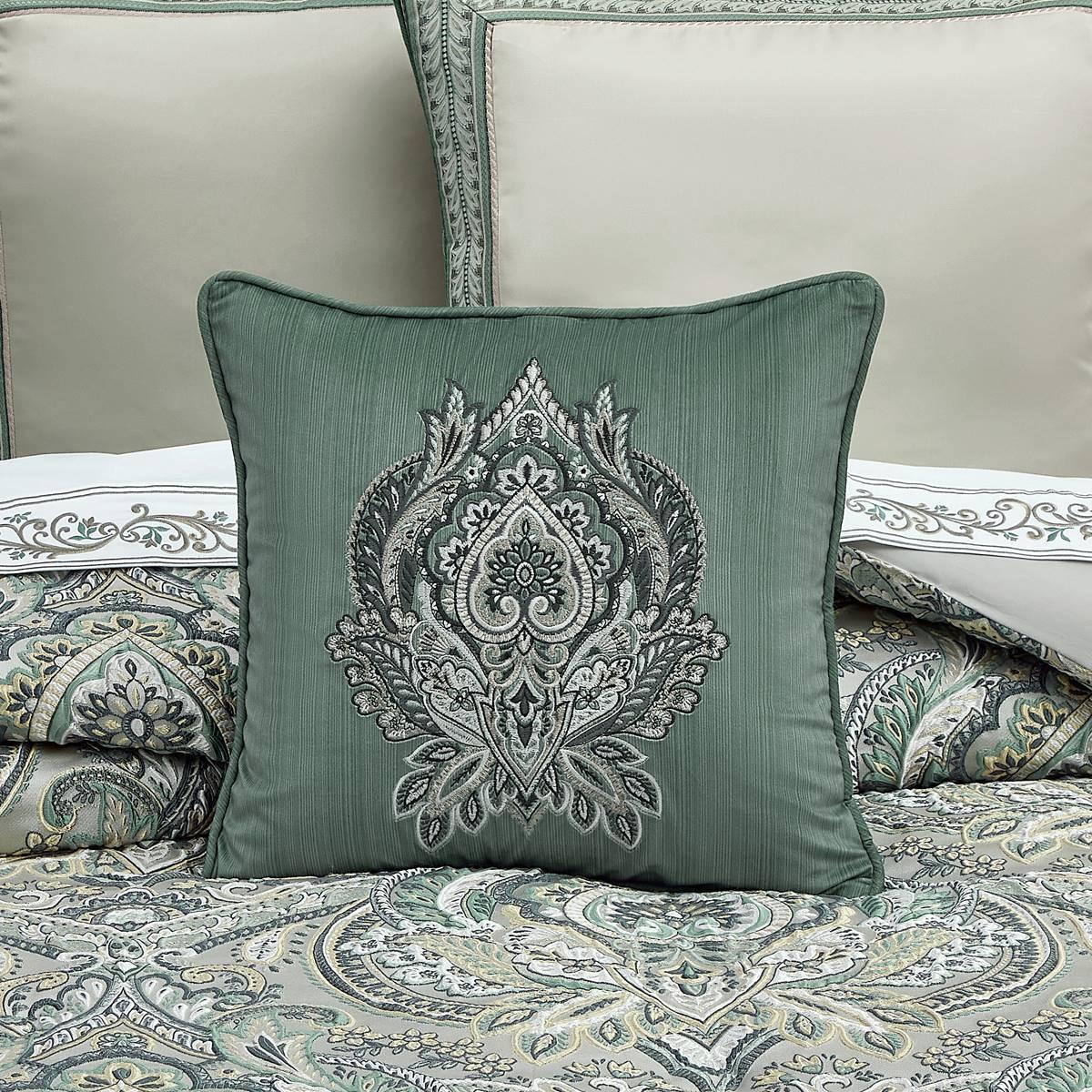 The J. Queen New York Nico 18-inch decorative throw pillow features a stunning teal velvet fabric with a highly detailed multi-color damask embroidered design. This luxe accent pillow is finished with a self-fabric cord and was designed to coordinate with the Nico bedding collection.