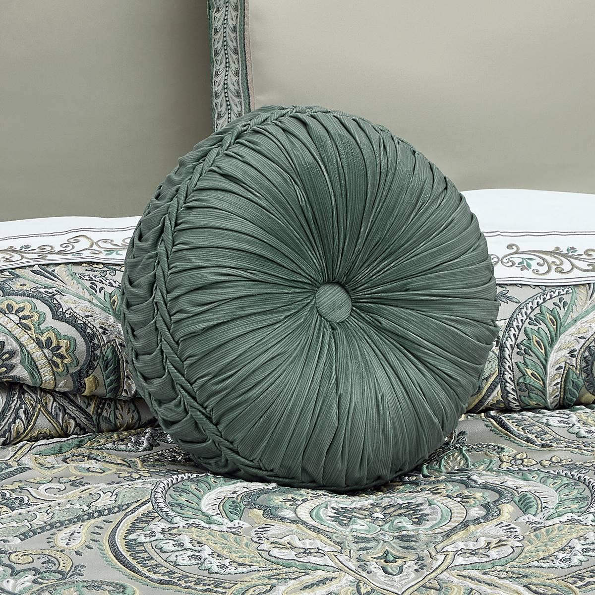 The J. Queen New York Nico tufted round throw pillow uses a stria teal velvet fabric to create a one-of-a-kind accent to this bedding ensemble. These unique pillows are hand-tufted and are finished with a fabric button accent on both sides.