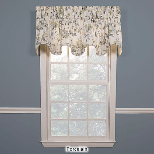 The Abigail scalloped valance features a gorgeous, watercolor-inspired floral print on a heavy-weight, lined fabric. Available in two stunning colorways: Porcelain (shades of light blue and sage) or Multi (brighter greens with pops of blue and pink). Rod pocket fits up to a 1 3/8" diameter drapery rod. 52% Polyester, 48% Cotton. Machine wash cold, gentle cycle. Never bleach. Hang dry. Touch up with warm iron as needed. 1 Valance per package. Size: 70" x 17".