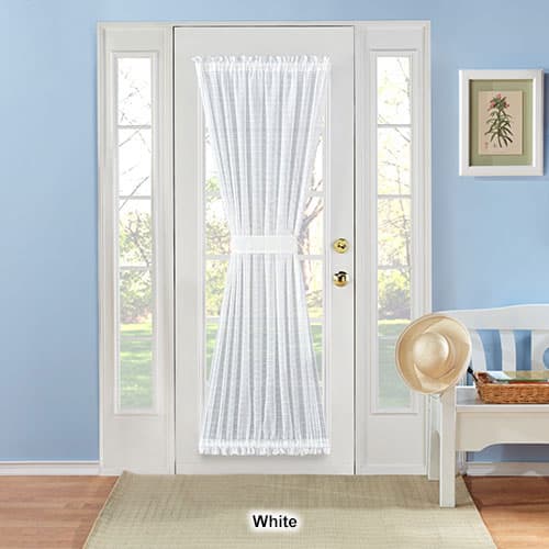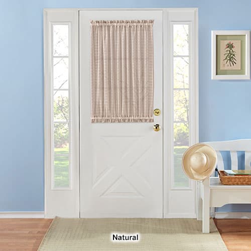 The Montauk door curtain panel features a woven check on a beautiful, sheer fabric. It's the way to add privacy to your glass doors while still allowing light to be filtered into your room. Available in your choice of ivory, or natural. 100% Polyester. Machine wash. Line dry. Warm iron as needed. Sizes: 53x40, 53x45, or 53x72.