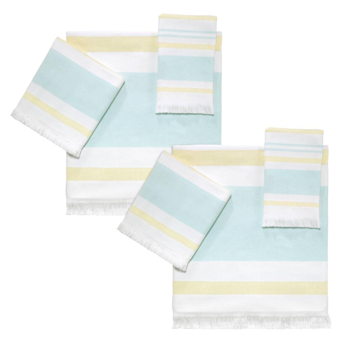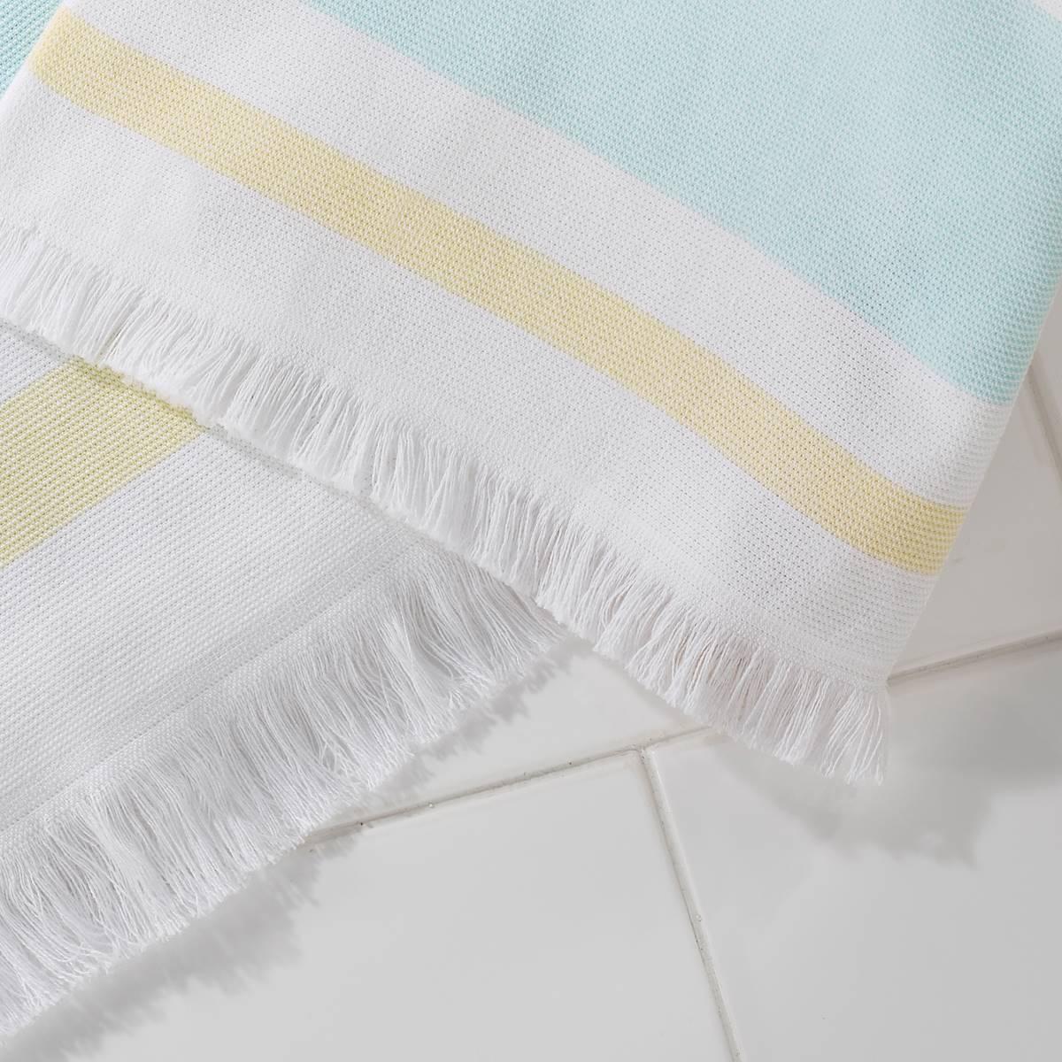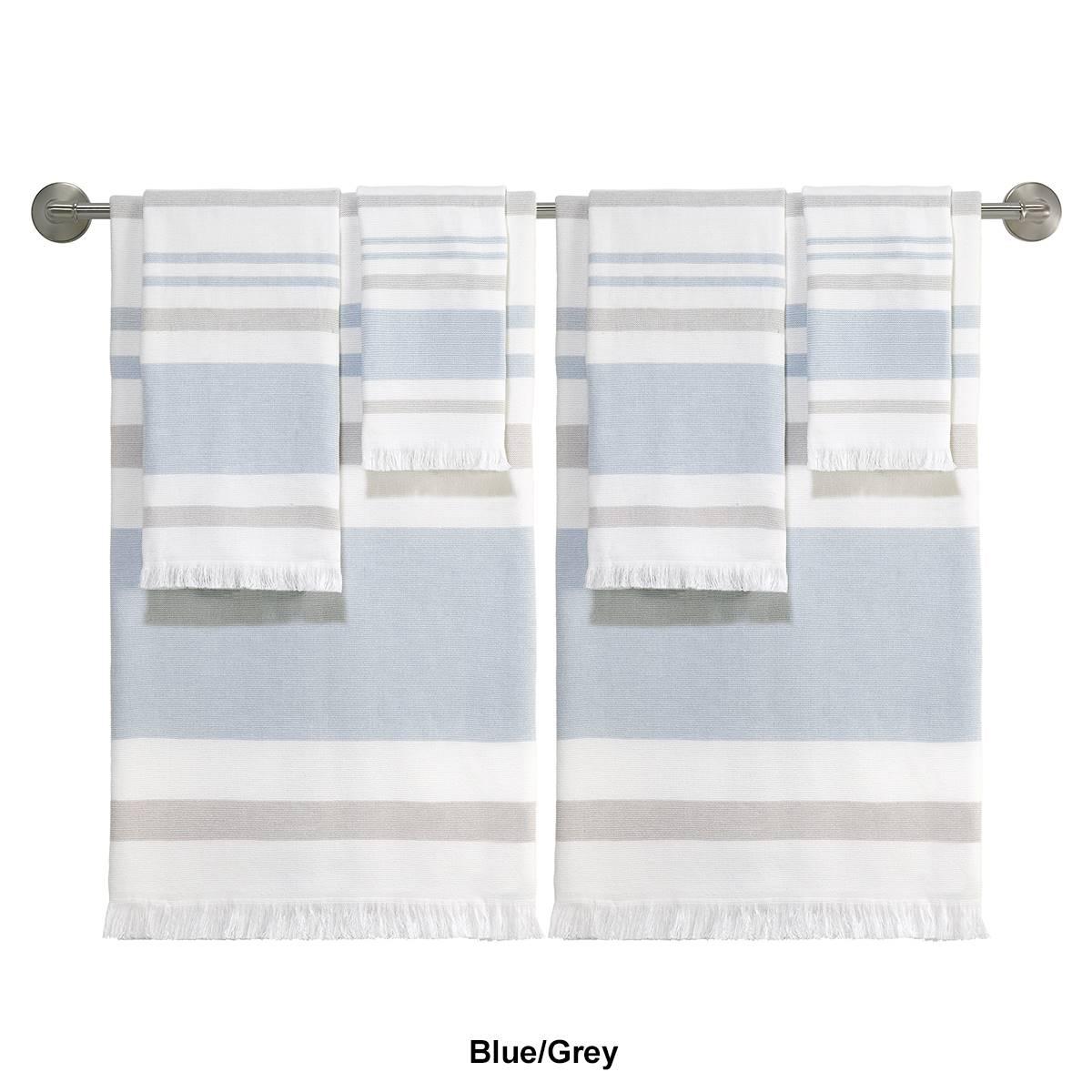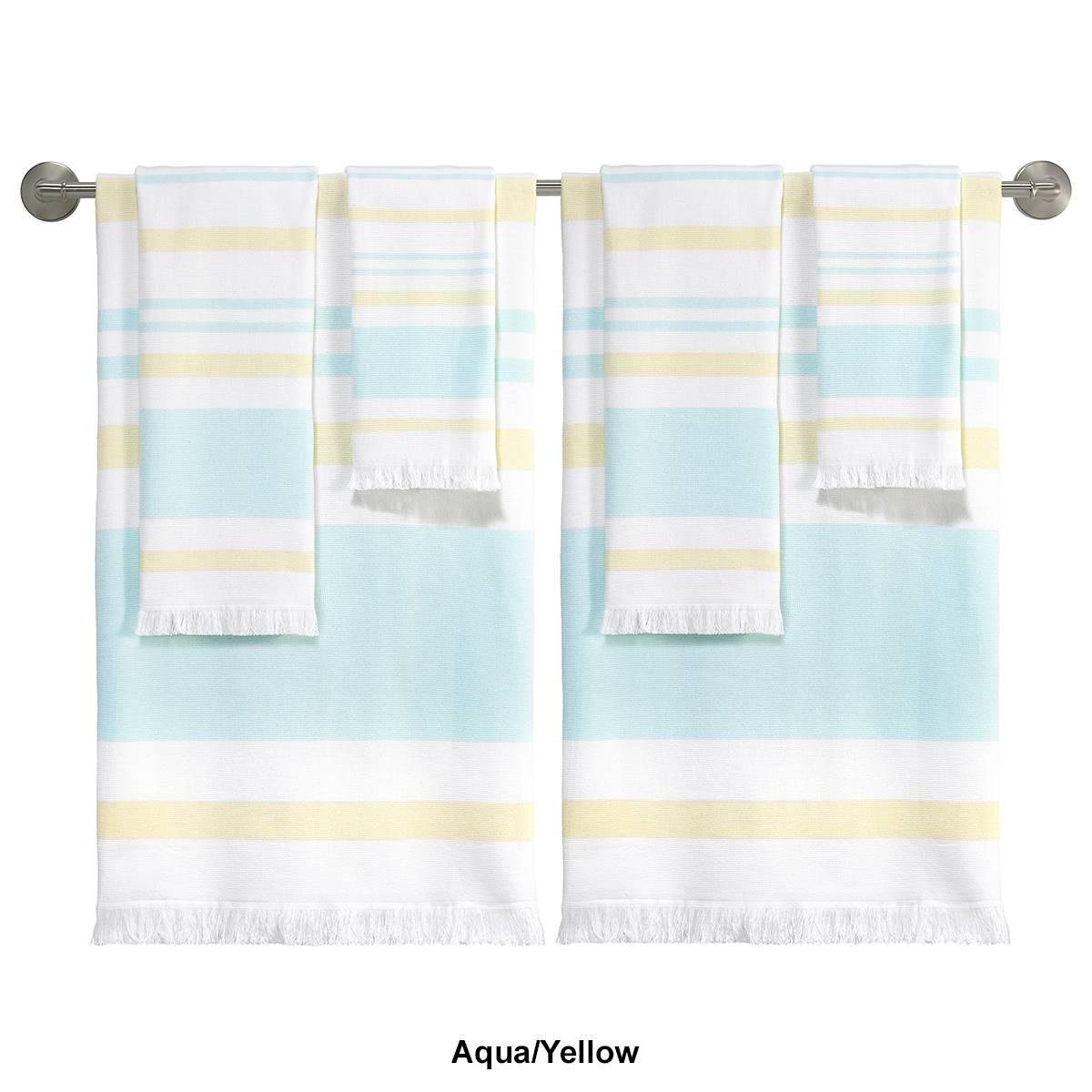 The IZOD(R)Clubhouse Stripe 2-pack hammam bath towel collection features a woven stripe design finished with fringe on both ends. The hammam-style towel is flat woven on one side and reverses to terry lightweight and fast-drying. Each size includes 2 towels Fingertip Towel: 18x11 Towel: 52x27 Hand Towel: 28x16.