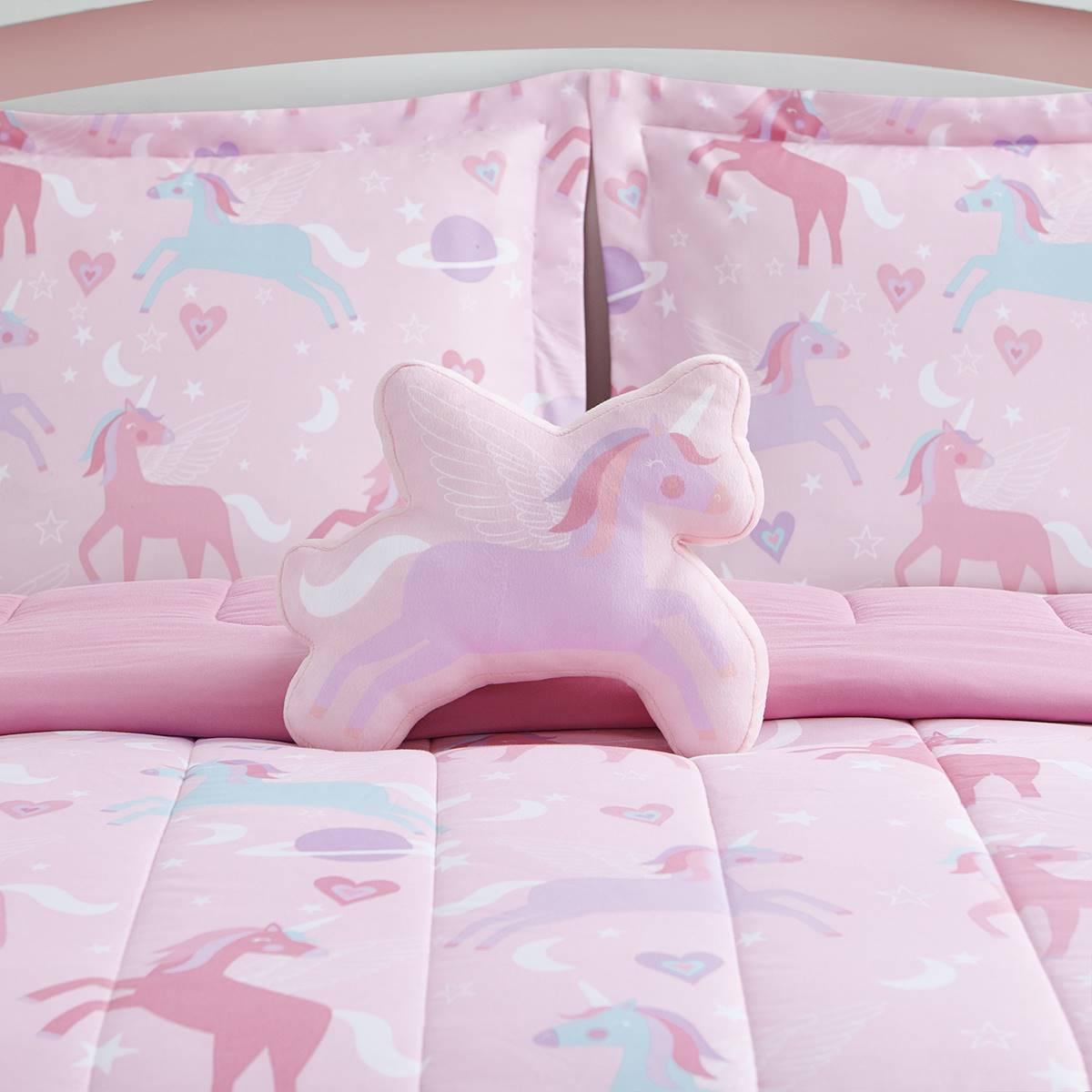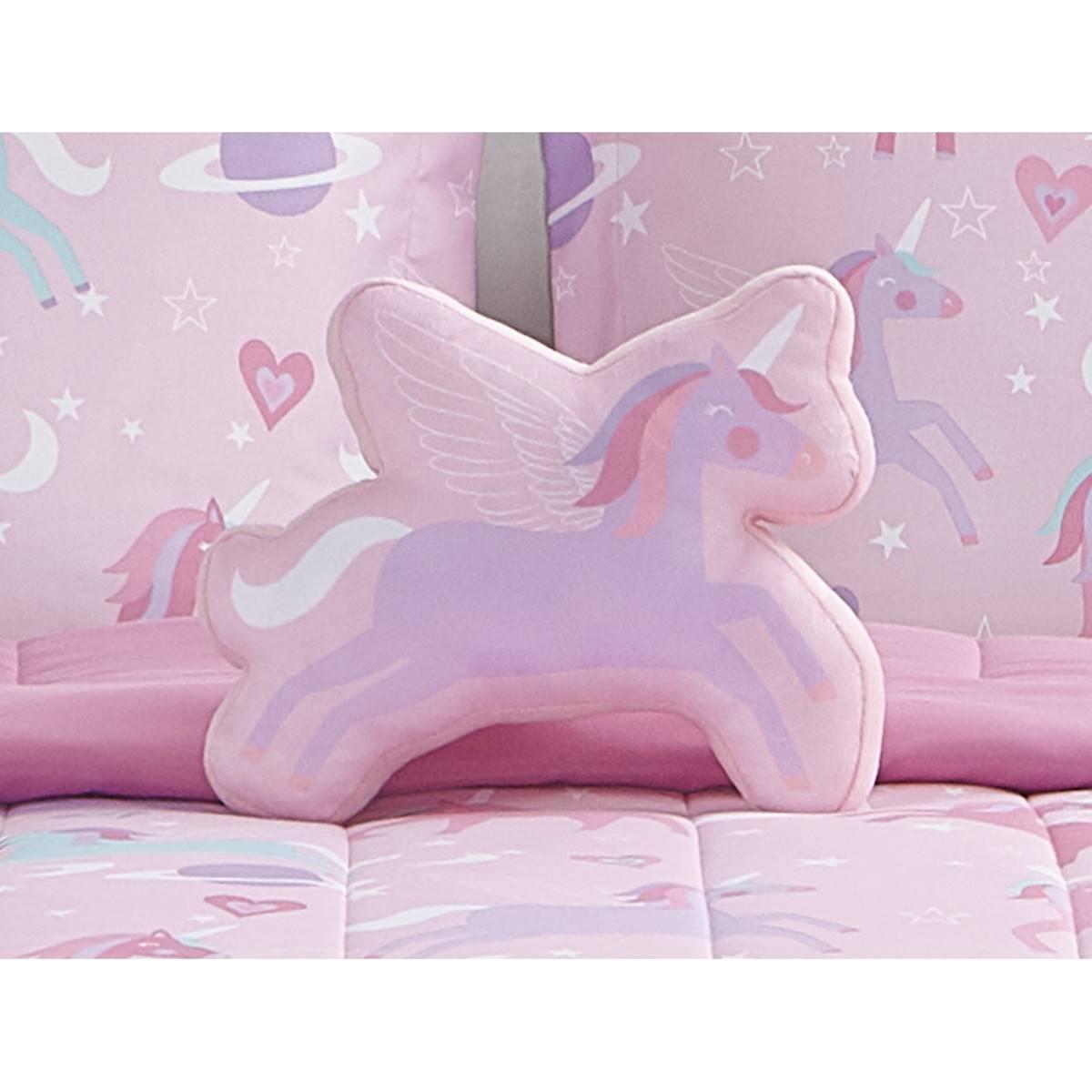 Add a touch of whimsy to their sleep space with this Alex & Bella Unicorn Planet Microfiber Comforter Set featuring magical flying unicorns, planets, moons, and stars. The lightweight material is breathable yet cozy for year-round use and easy care. Create sweet dreams when your little one is snuggled in this starry unicorn bedding set. includes: 68" x 86" comforter, (1) 20" x 26" standard shams, (1) 11.4" x 9.8" x 1.2" unicorn throw pillow Full set included: 108" x 96" comforter, (2) 20" x 26" standard shams, (1) 11.4" x 9.8" x 1.2" unicorn throw pillow.