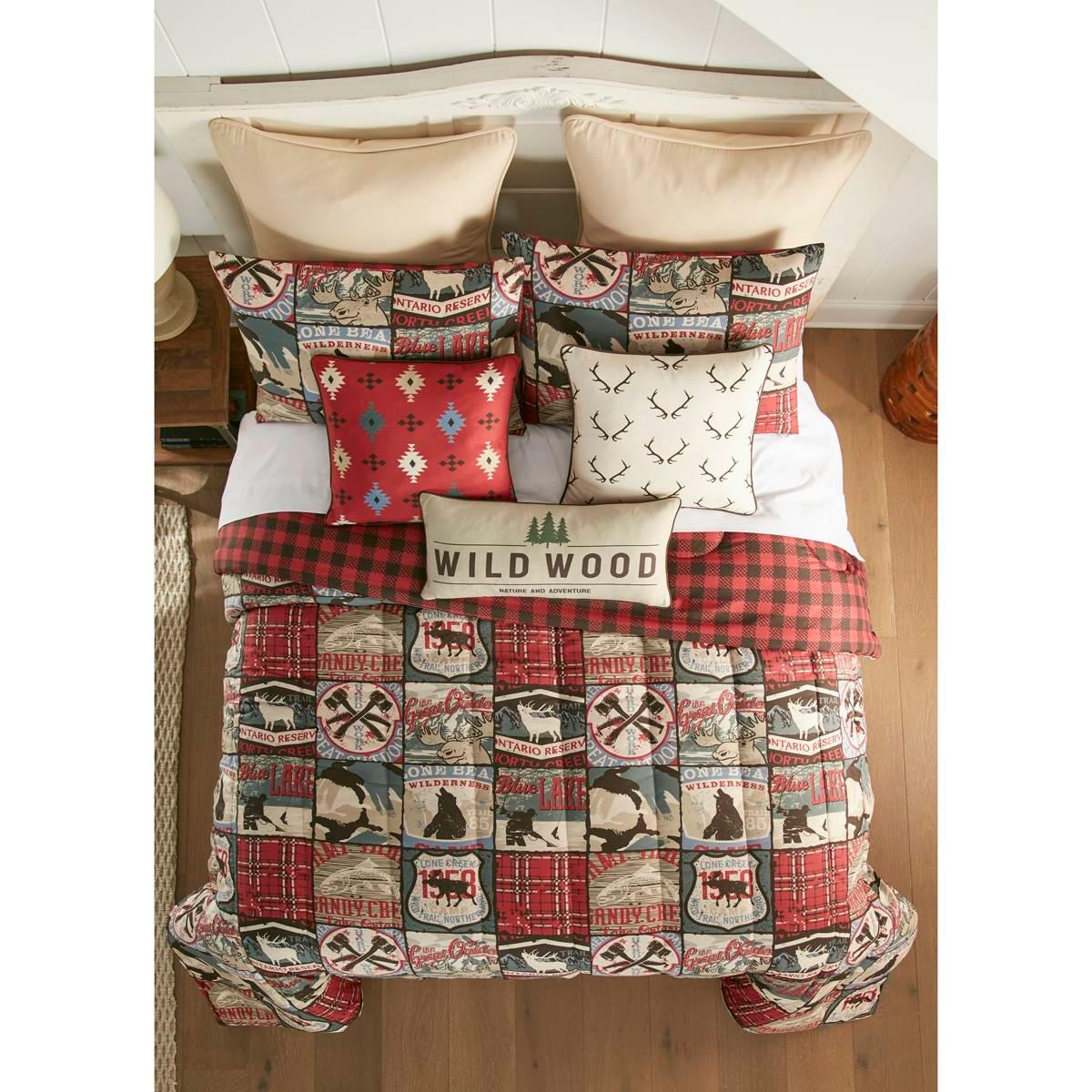 Upgrade your bedroom with Your Lifestyle by Donna Sharp The Great Outdoors Comforter Set. Features a series of wilderness signs arranged in a block pattern. Motifs include bear, elk, and moose with fisherman, camo, and plaid. The reversible lining is aand chocolate brown lodge check pattern, so you get two designs in one! Set includes: (1) 90" x 90" Comforter, (2) 20" x 26" Standard Shams King Set includes: (1) 104" x 96" Comforter, (2) 20" x 36" King Shams.