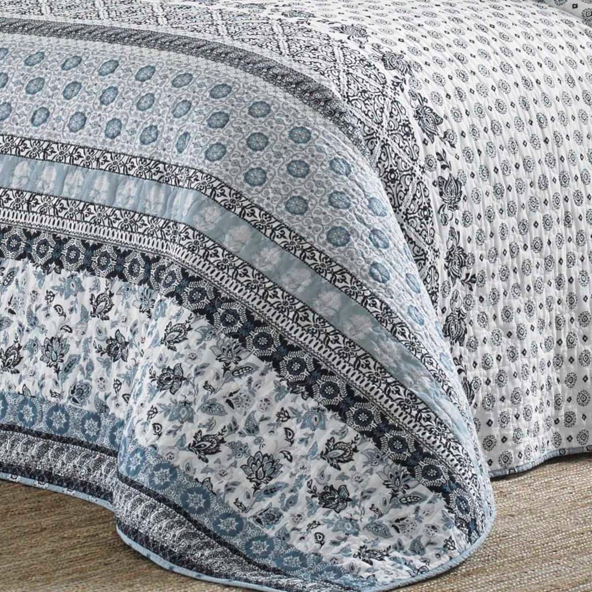This Stone Cottage Bexley 136 Thread Count Reversible Quilt Set will bring out your inner bohemian. This beautiful print incorporates a mix ofprovincial block prints arranged in a patchwork stripe layout. set includes: (1) 68" x 88" Quilt, (1) 21" x 27" Standard Sham Queen set includes: (1) 90" x 90" Quilt, (2) 21" x 27" Standard Shams King set includes: (1) 104' X 96" Quilt, (2) 21" x 37" King Shams.