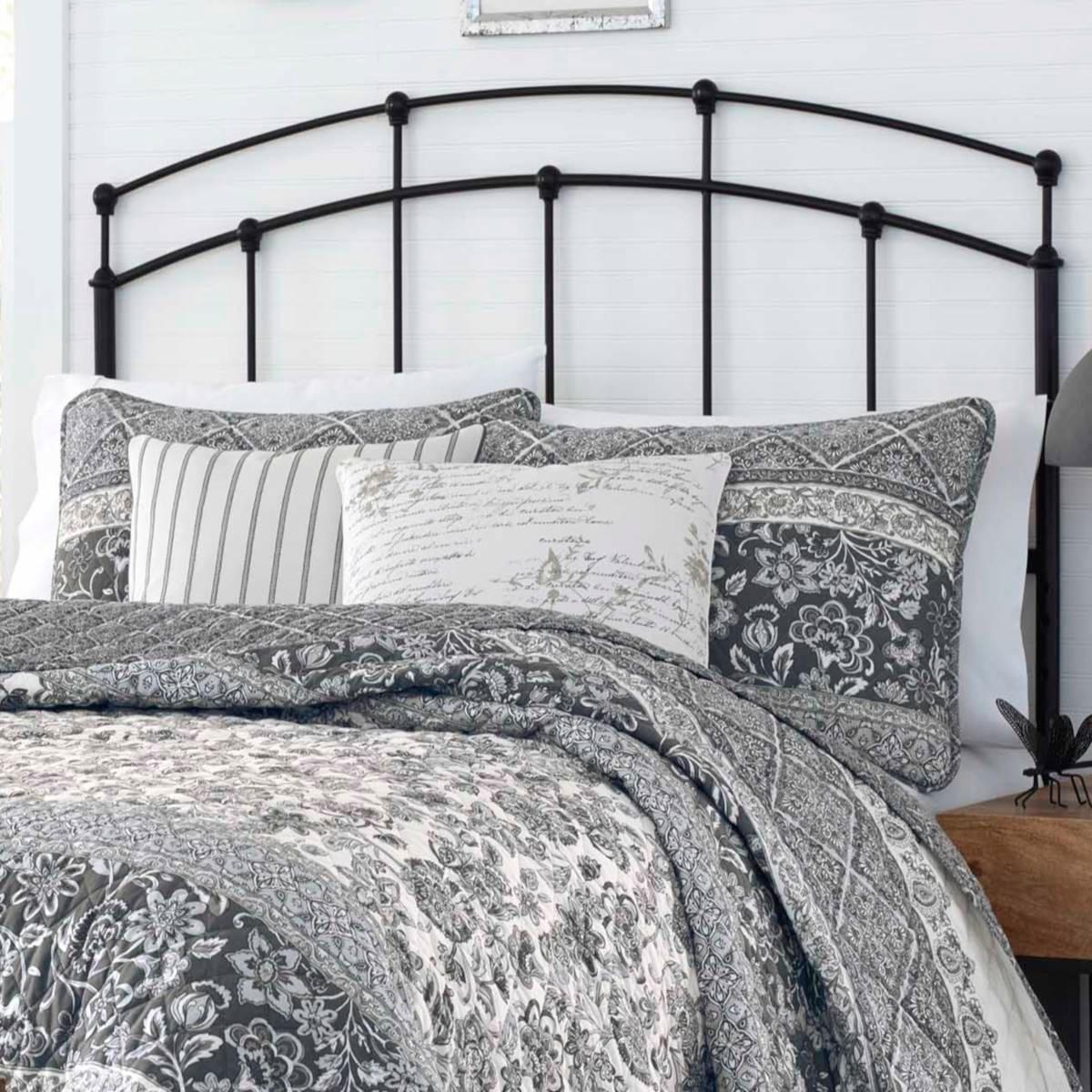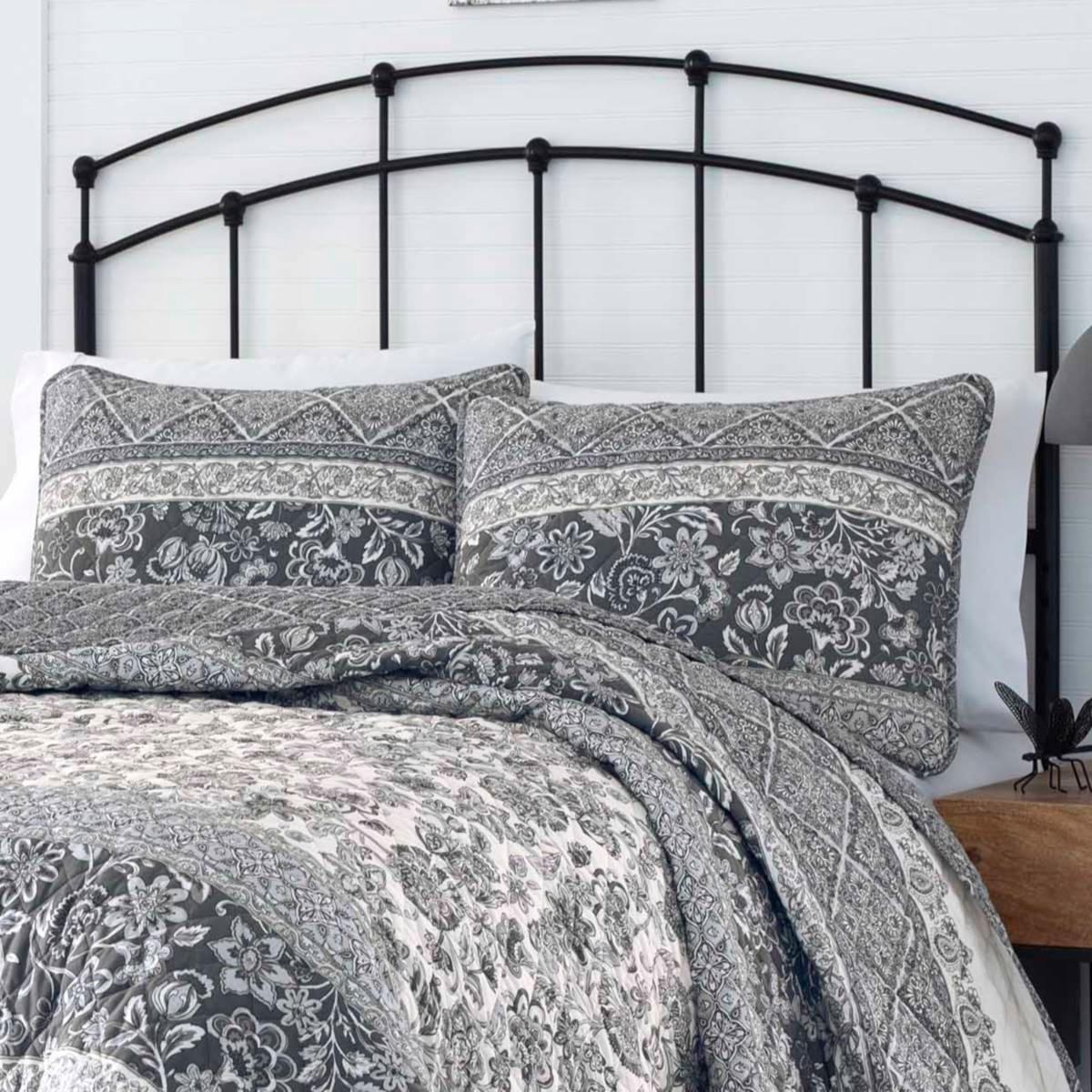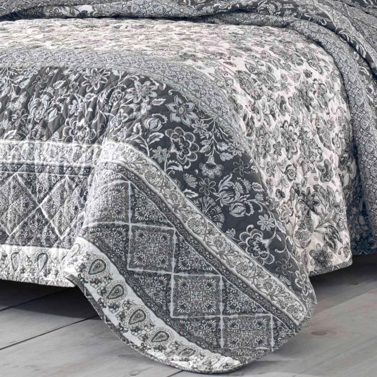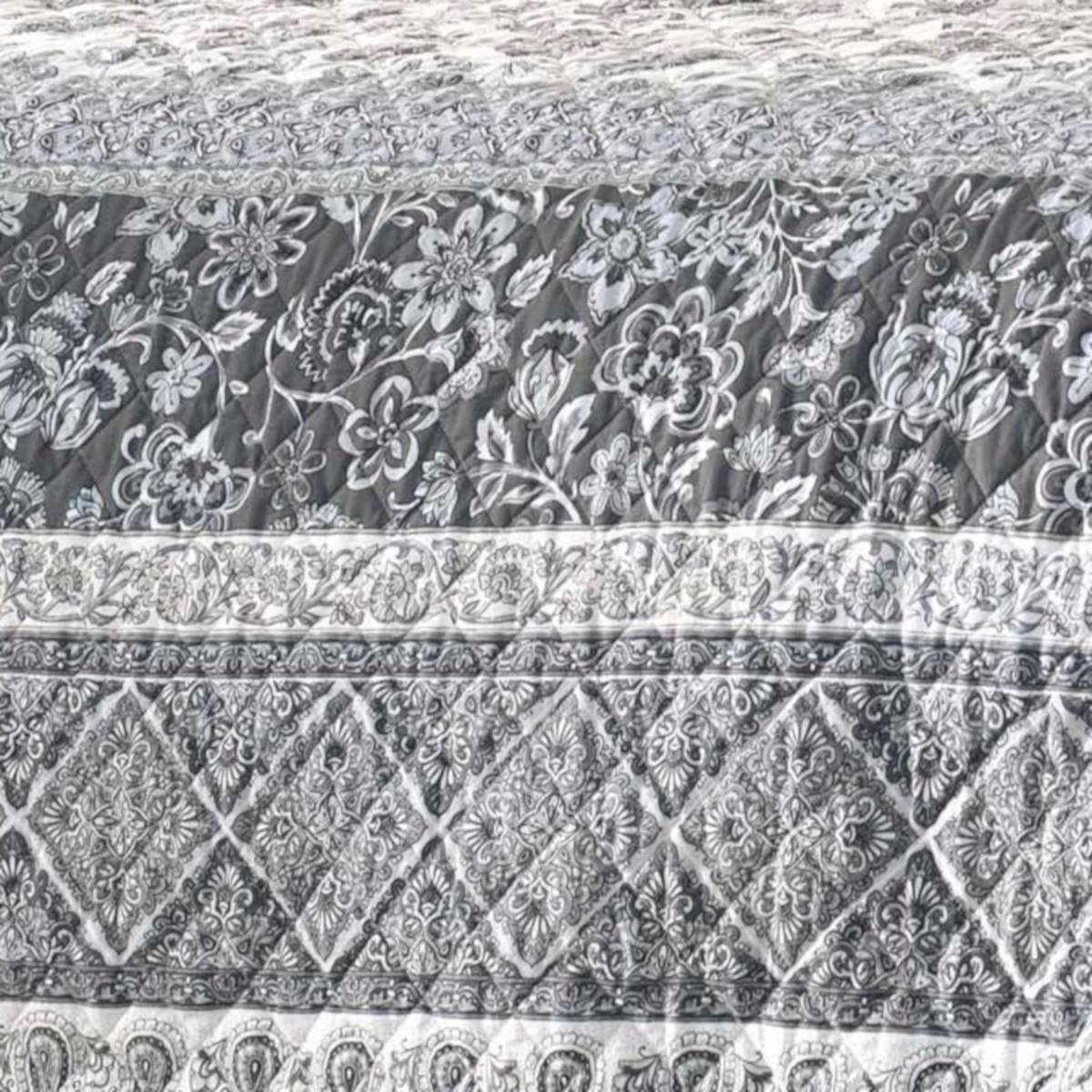 This Stone Cottage Abby 136 Thread Count Reversible Quilt Set has wide bands of intricately detailed paisley and jacobean floral patterns. The front of the quilt is a classic palette of slate blue with greys and white, while the reverse is the diamond pattern. set includes: (1) 68" x 88" Quilt, (1) 21" x 27" Standard Sham Queen set includes: (1) 90" x 90" Quilt, (2) 21" x 27" Standard Shams King set includes: (1) 104' X 96" Quilt, (2) 21" x 37" King Shams.