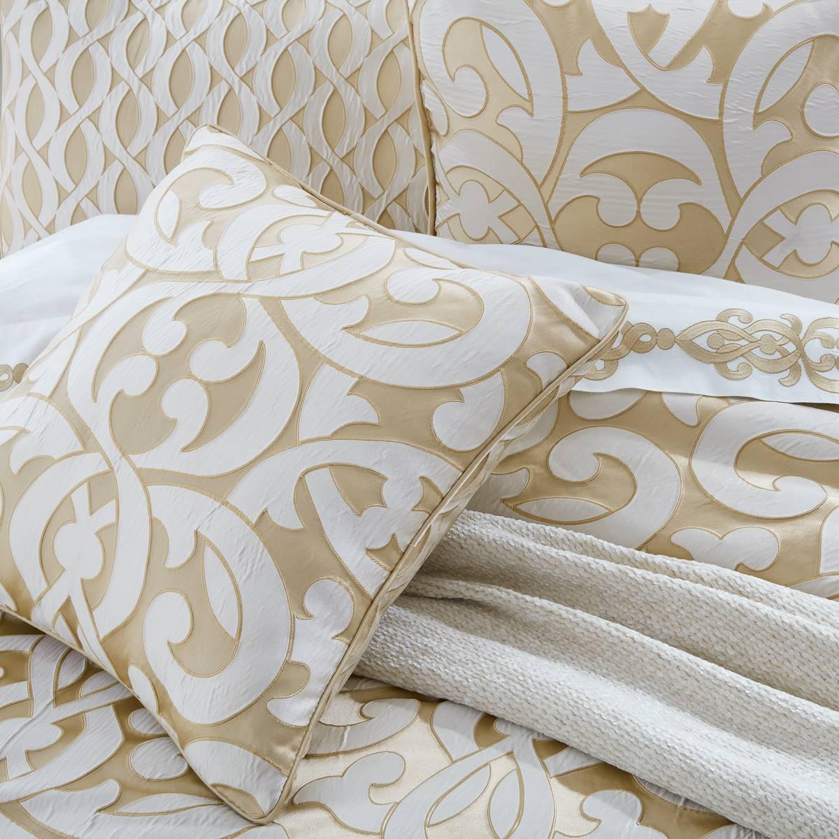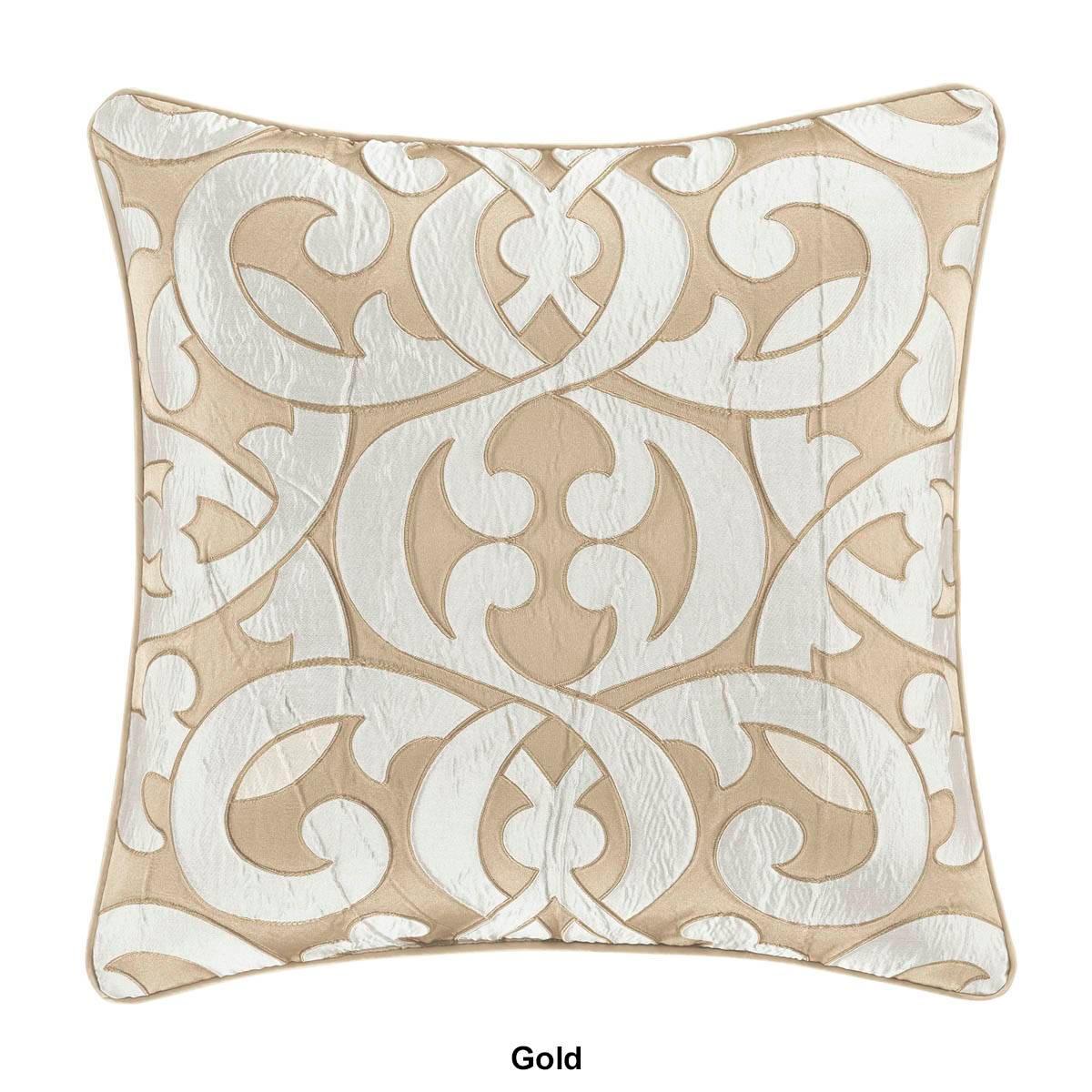 Get an updated luxe look in your room with this J. Queen New York La Boheme square decorative pillow. Showcasing the large golden damask pattern on one side and a stunning geometric pattern on the other for added versatility. A small satin cord finishes the pillow on all four sides. Includes: (1) Decorative pillow.
