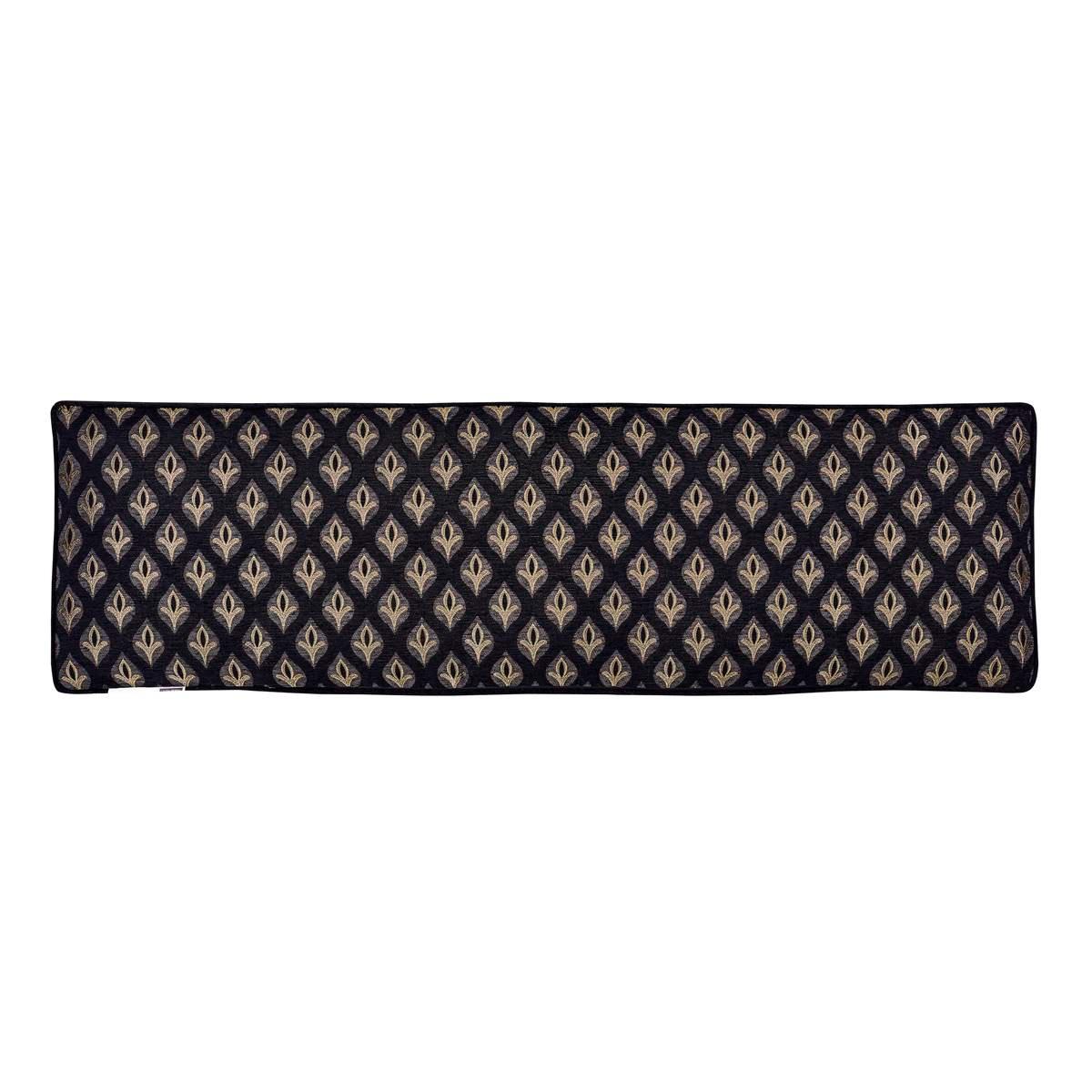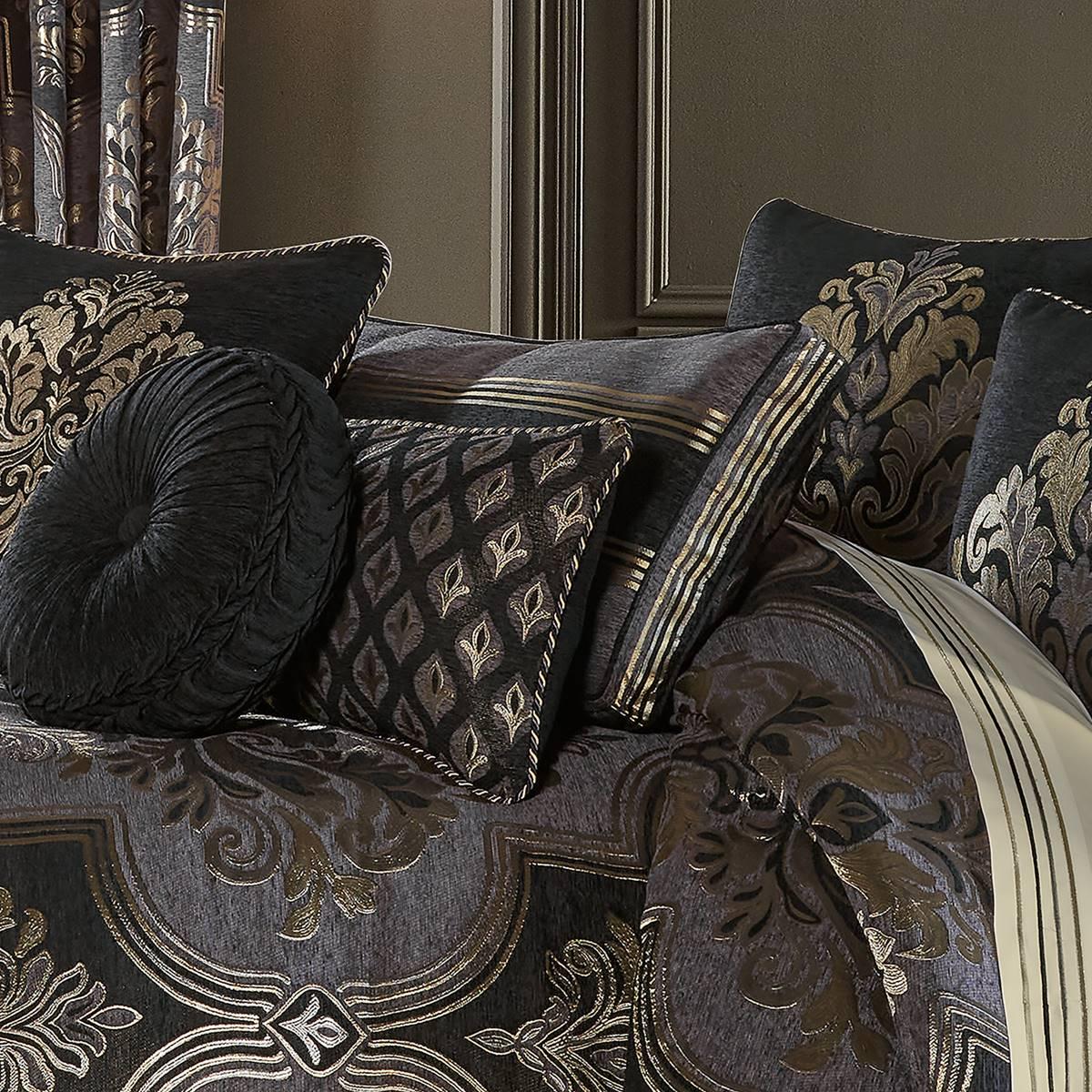 This J. Queen New York Savoy bolster decorative throw pillow adds a luxurious look to your room. The oversized accent pillow spans the width of the bed and is perfect for propping you up when reading. It is a reversible pillow featuring a wide gold band framing the black chenille andstripes. Includes: (1) Decorative pillow.