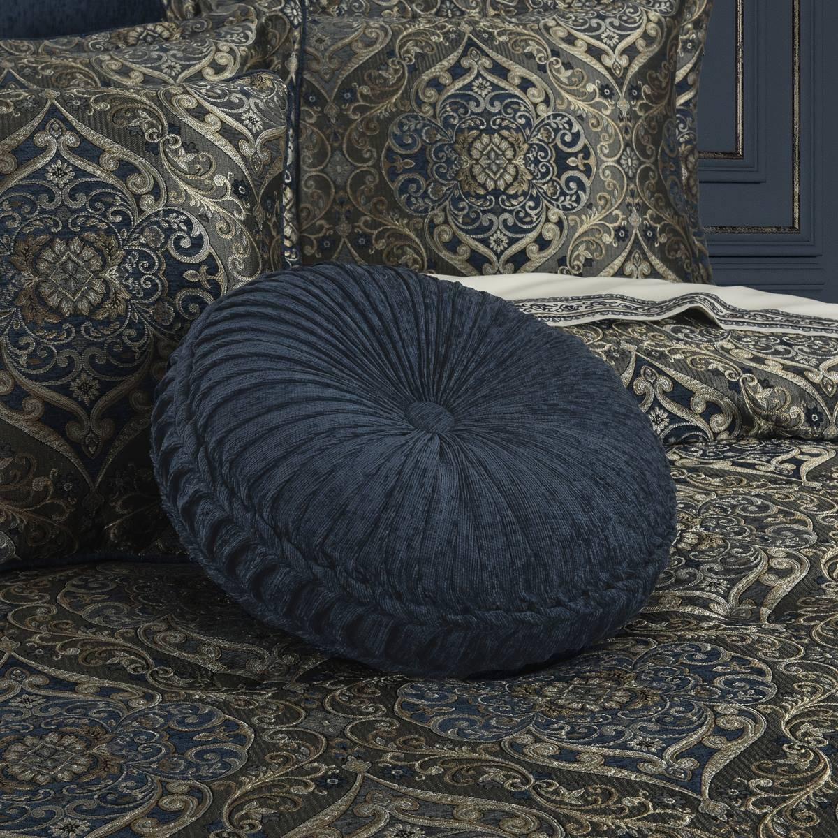 This J. Queen New York tufted round pillow uses luxuriouschenille to create a one-of-a-kind accent to this bedding ensemble. These unique pillows are sewn by hand and are finished with a fabric-covered button on both sides.