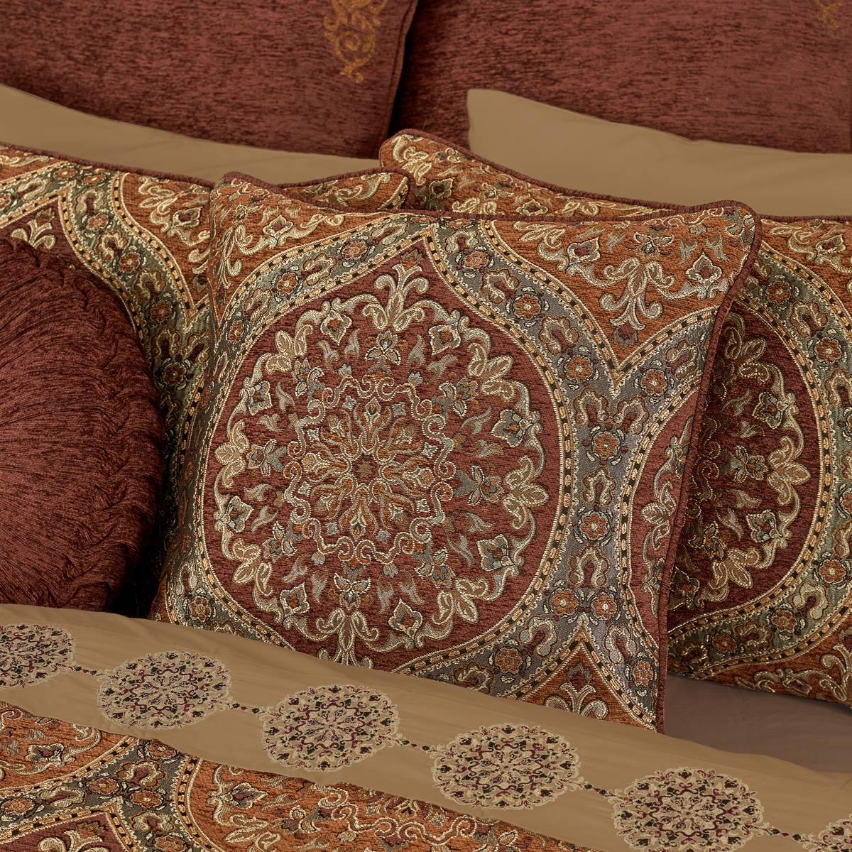 This J. Queen New York Harvest Moon 20-inch decorative throw pillow is exquisite with its sophisticated use of terracotta and gold colors. The beautiful square accent pillow is rich with a traditional yet timeless woven jacquard medallion design. This pillow is reversible with a soft chenille finish on the reverse and finished with chocolate piping for added detail. Pair this pillow with the Harvest Moon bedding set by J. Queen New York for a complete look. This item requires oversize delivery. Please refer to the Order Summary in the Shipping step at checkout for delivery charge.