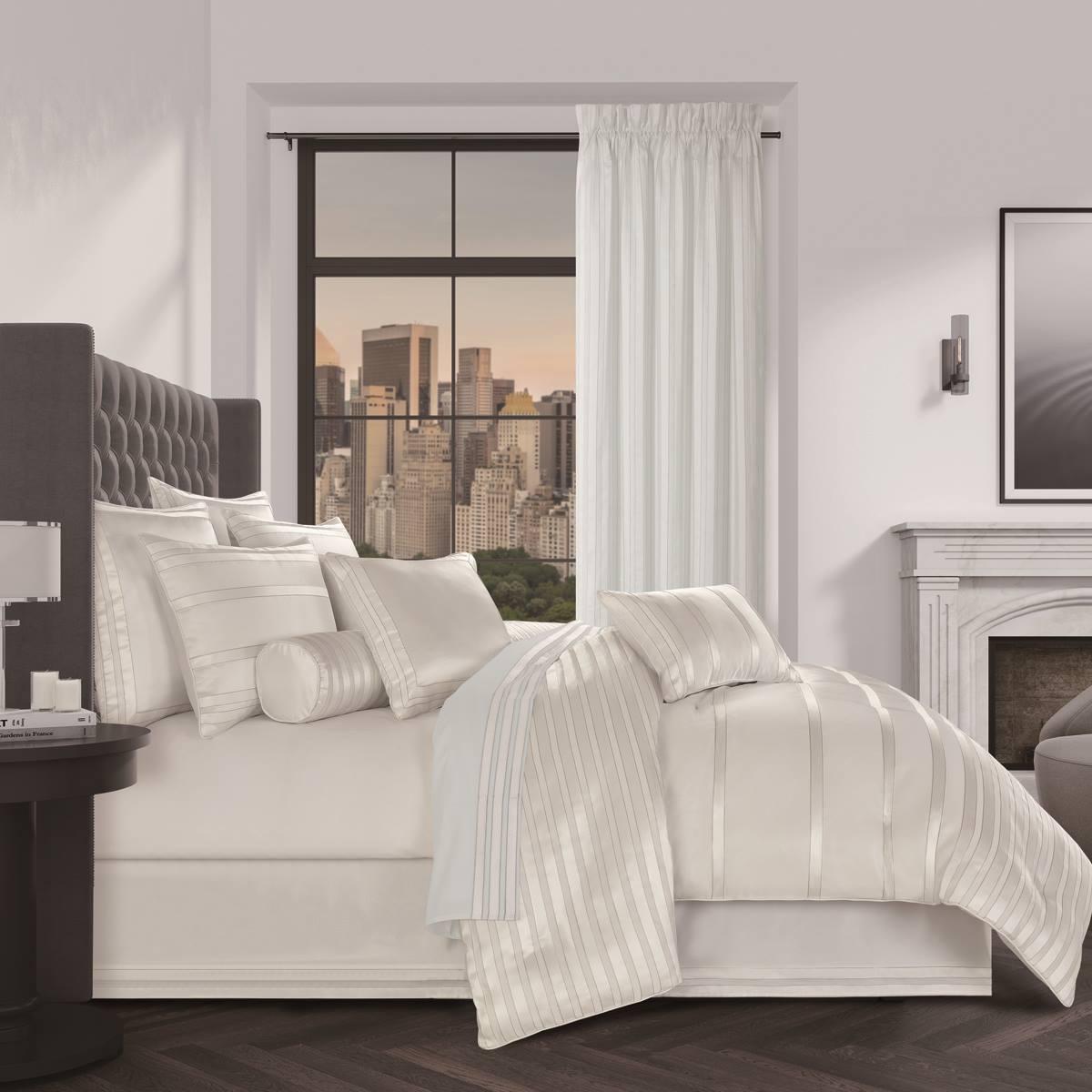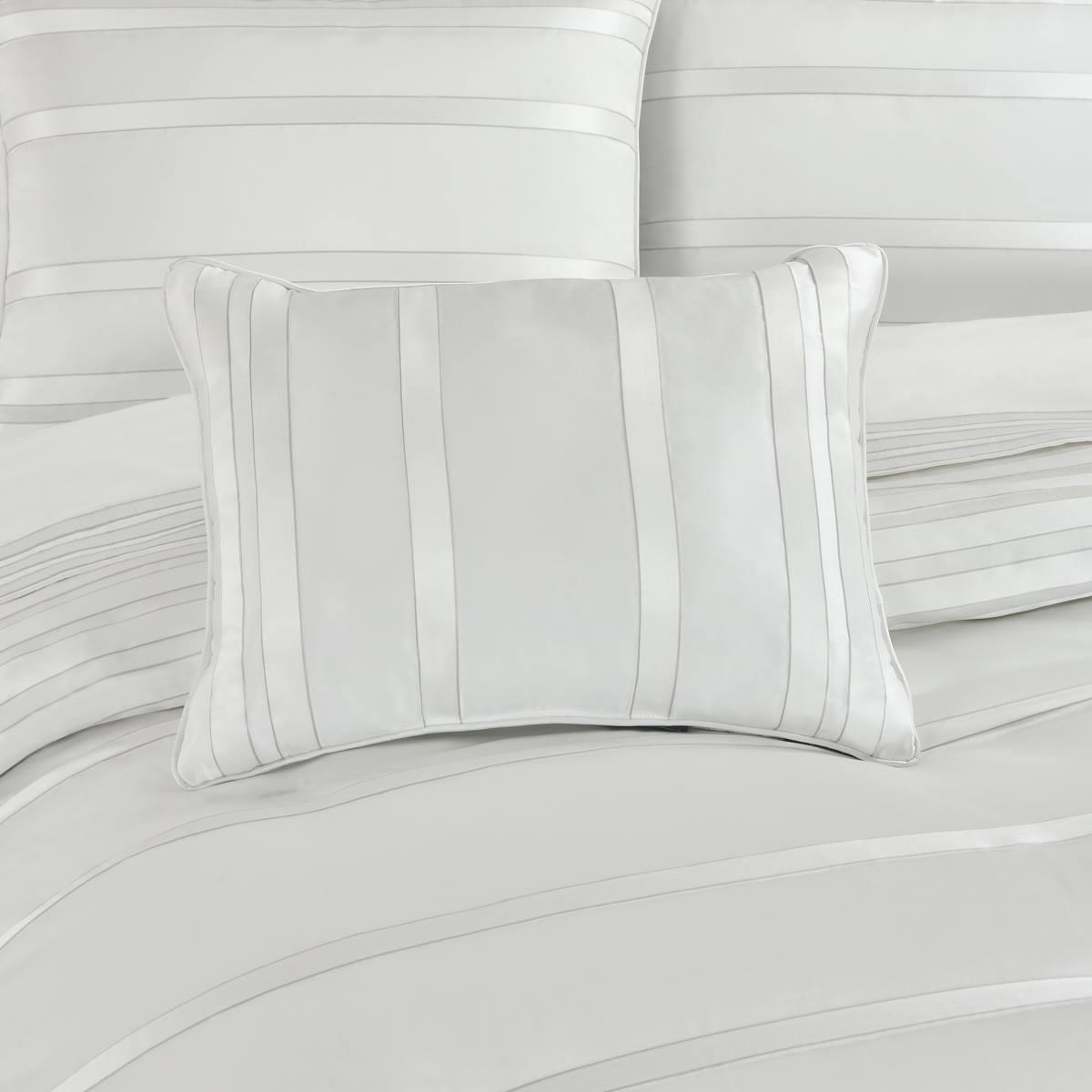 The J. Queen New York Calvari Boudoir decorative throw pillow offers a modern lustrous look with its geometric polishedstripes on a plush white satin fabric. Further details include an all-around satin piping for a tailored finish. Pair this pillow with the Calvari bedding set by J. Queen New York for a clean contemporary look. Made from high-quality designer fabrics.