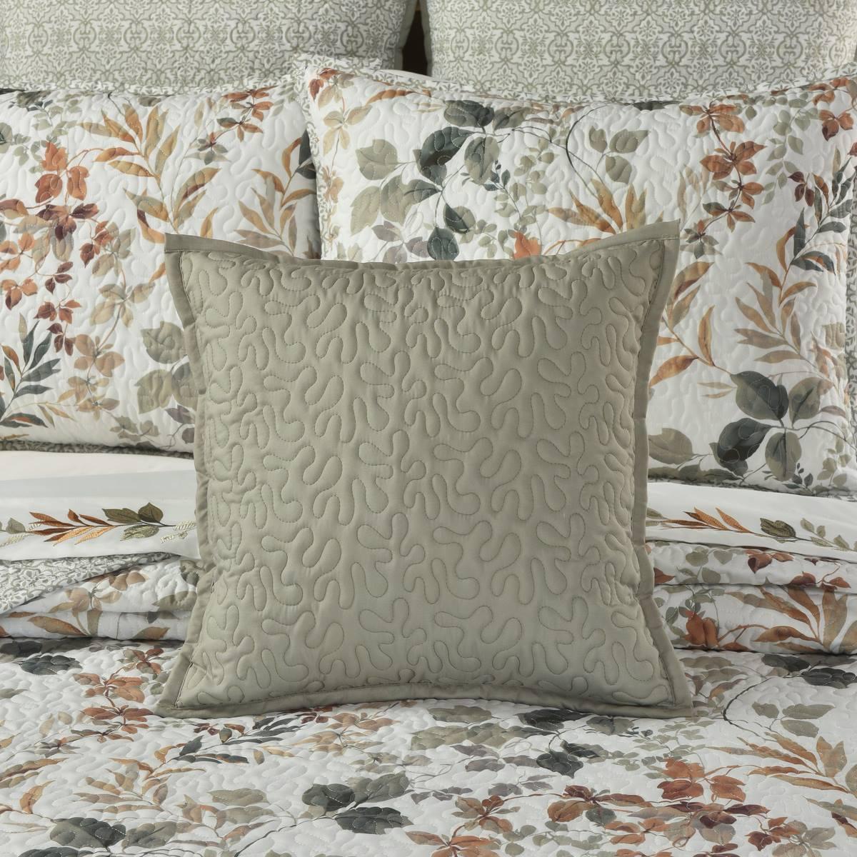 The Royal Court Evergreen 16-inch square decorative throw pillow is quilted on a lightly brushed solidmicrofiber with a vermicelli quilted pattern. This classic earth-tone accent pillow is finished with self-fabric piping and layers perfectly with the Evergreen bedding ensemble and window treatments to complete the look. Made from high-quality designer fabrics.