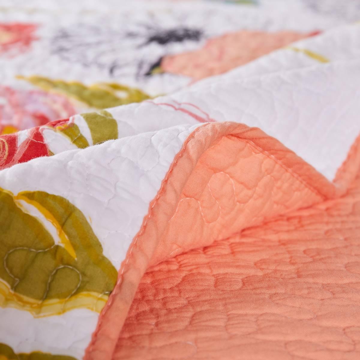 Cheer up your sleeping space with the artfully chic Watercolor Dream quilt and decorative pillow set. Sprouts of color bloom beside stenciled flower illustrations on the quilt face. The quilt reverses to a coordinating solid color for two looks in one. Whimsical decorative pillows feature flower petals and a bicycle illustration. Oversized for better coverage on today's deeper mattresses. The quilt set comes with a quilt and two pillow shams (one sham per set), plus two stuffed decorative pillows. set includes: (1) 68" x 88" quilt, (1) 20" x 26" pillow sham, and (2) 18" x 18" decorative pillows Full/Queen set: includes (1) 90" x 90" quilt, (2) 20" x 26" pillow shams, and (2) 18" x 18" decorative pillows King set: includes (1) 105" x 95" quilt, (2) 20" x 36" pillow shams, and (2) 18" x 18" decorative pillows All dimensions +/- 2 inches.