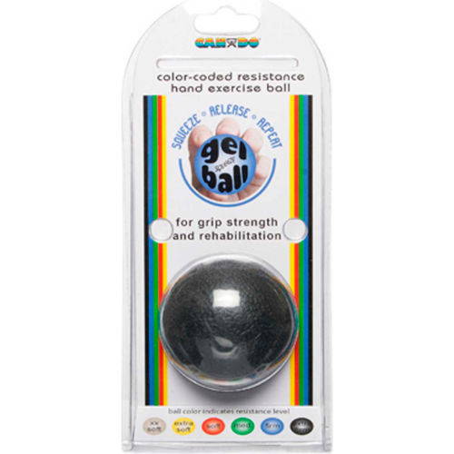 CanDo Gel Squeeze Ball hand exerciser for grip strength, dexterity, mobility, and fine and gross motor skills. Heat or chill for use in hot or cold therapy. Available in 6 color-coded resistance levels. Each level (firmness) available in circular or egg shape. Balls can withstand temperatures ranging from -76 F to 167 F. Standard Circular - Black - X-Heavy.