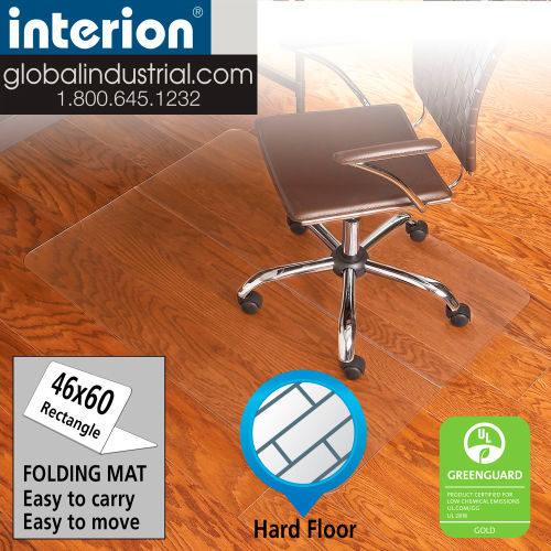 This versatile chair mat immediately unfolds for instant use right out of the box. The ability to fold the mat, reduce its size and easily move it from one are to the next is advantageous for workspaces that change or move. This sturdy, vinyl mat from Interion By Global Industrial will help prolong the life of valuable flooring by protecting against chair caster wear and tear. Any chair user will be able to maneuver their chair easily and effortlessly, as this mat withstands heavy traffic and features an anti-skid textured top. This chair mat is ideal for use on laminate, wood, tile and other hard floor surfaces. Chair Mat Dimensions: 46"W x 60"L. 1/10" thick. Straight Edge. GREENGUARD Gold Certified for Low Chemical Emissions to UL 2818 Lifetime Limited Warranty MADE IN THE USA.