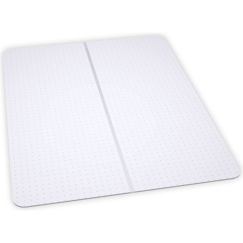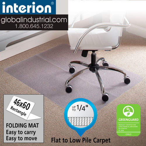 Interion Office Chair Mat for Carpeted Floor This versatile chair mat immediately unfolds for instant use right out of the box. The ability to fold the mat, reduce its size and easily move it from one are to the next is advantageous for workspaces that change or move. This sturdy, vinyl mat from Interion By Global Industrial will help prolong the life of valuable flooring by protecting against chair caster wear and tear. Any chair user will be able to maneuver their chair easily and effortlessly, as this mat withstands heavy traffic and features an anti-skid textured top. Mat underside has anchor points to keep mat firmly positioned on carpeted surfaces. This chair mat is ideal for low pile carpet up to 1/4" thick, including padding. Chair Mat Dimensions: x x 1/10" thick. Straight Edge. GREENGUARD Gold Certified for Low Chemical Emissions to UL 2818 Lifetime Limited Warranty MADE IN THE USA.