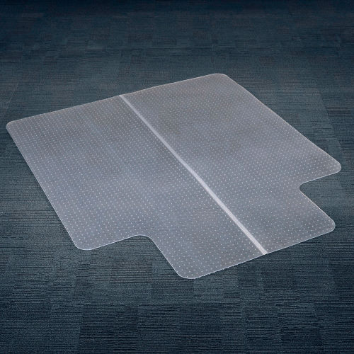 Interion Office Chair Mat for Carpeted Floor This versatile chair mat immediately unfolds for instant use right out of the box. The ability to fold the mat, reduce its size and easily move it from one are to the next is advantageous for workspaces that change or move. This sturdy, vinyl mat from Interion By Global Industrial will help prolong the life of valuable flooring by protecting against chair caster wear and tear. Any chair user will be able to maneuver their chair easily and effortlessly, as this mat withstands heavy traffic and features an anti-skid textured top. Mat underside has anchor points to keep mat firmly positioned on carpeted surfaces. This chair mat is ideal for low pile carpet up to 1/4" thick, including padding. Chair Mat Dimensions: 45"W 53"L with Lip, 1/10" thick. Straight Edge. GREENGUARD Gold Certified for Low Chemical Emissions to UL 2818 Lifetime Limited Warranty MADE IN THE USA.