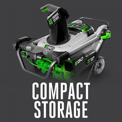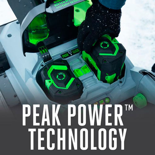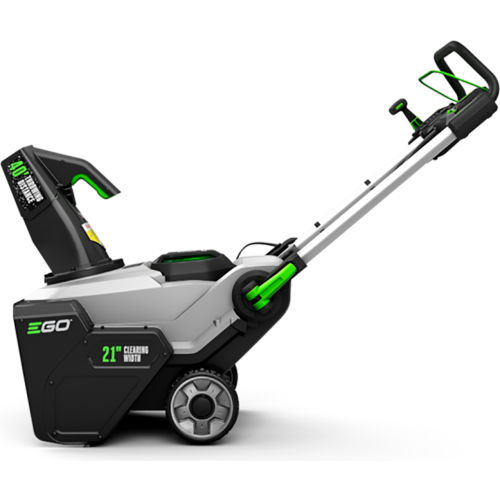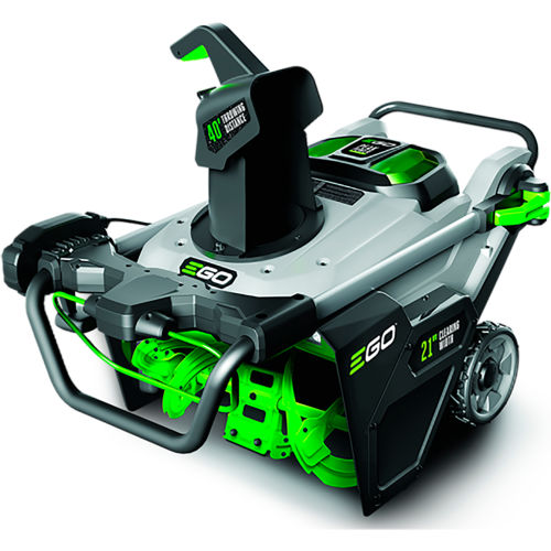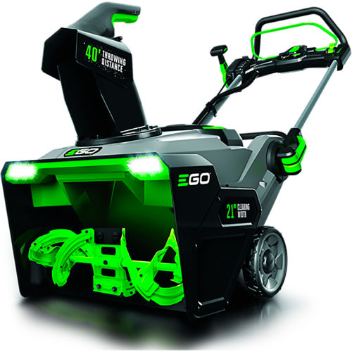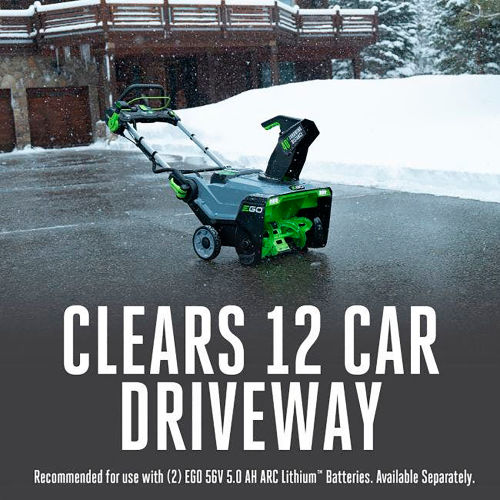 Featuring Peak Power technology, this cordless snow blower combines the power of any two EGO 56V ARC Lithium batteries for the power to clear heavy, wet snow with a throwing distance up to 40 ft. DETAILS: The new EGO POWER+ SNT2112 Cordless Snow Blower delivers the power and performance of gas without the noise, fuss and fumes. Featuring Peak Power technology, it combines the power of any two EGO 56V ARC Lithium batteries for the power to clear heavy, wet snow with a throwing distance up to 40 ft. Built with a high-efficiency brushless motor and steel auger, the EGO POWER+ Snow Blower handles what the city snow plow leaves behind with ease; cutting through ice and snow 50% faster*. The EGO POWER+ Snow Blower has the power to handle tough jobs fast without the noise, fuss and fumes of gas. *Compared to SNT2102 Features Peak Power technology combines the power of 2 EGO 56V ARC Lithium batteriesRecommend for use with two EGO 56V 5.0 Ah ARC Lithium batteries to clear 8" of snow on a 12 car drivewayThrows snow up to 40 ft. Steel auger cuts through ice & snow 50% faster*High-efficiency brushless motor21 in. clearing widthVariable speed auger controlWeather-resistant heavy-duty steel and composite construction to handle challenging conditions2 bright LED headlights for increased visibility for nighttime snow removalConvenient, handle-mounted chute adjustmentQuick-fold handle for compact storage5-year tool warrantyAuger Size: Length x Diameter: L:18" x D:8.5"Auger Type: MetalClearing Width: 21"Weather-resistant (ipx4) Intake Height: 13"Throwing Distance: 40 feet(2) 5.0 Ah Batteries included.