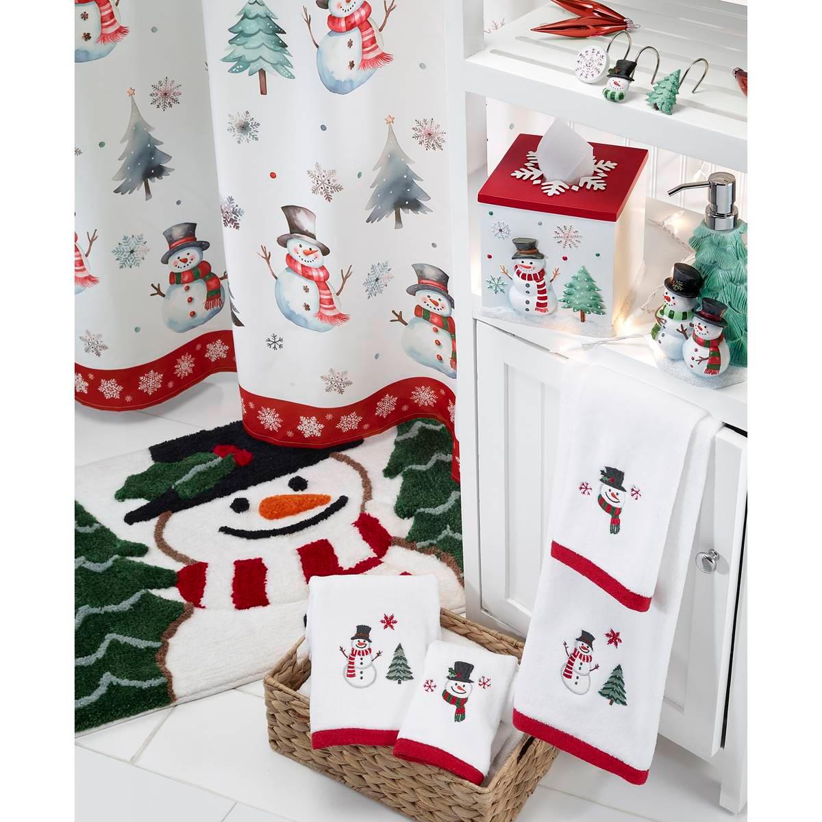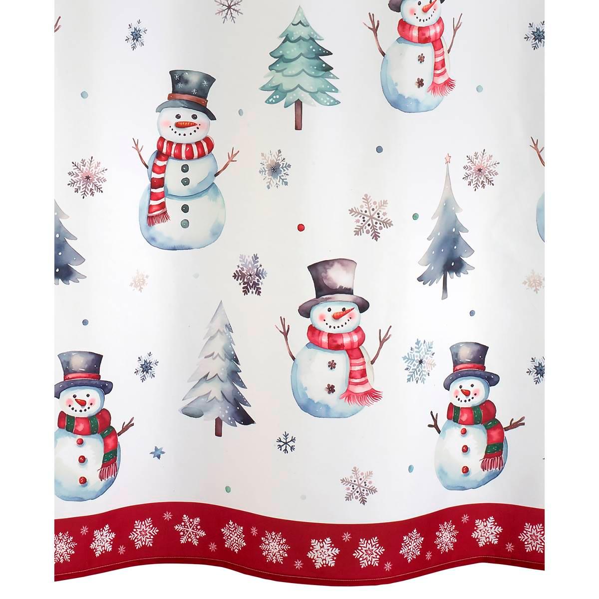 The Avanti Winter Snowman decorative shower curtain features a series of happy, colorfully scarved snowmen onground. Snow-covered pine trees, snowflakes, and stars, with a red snowflake border, finish the design.