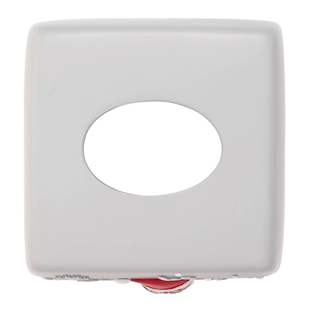 The Avanti Ho Ho Ho decorative tissue box cover features a dimensional holiday scene with Santa wearing black glasses and holding a bag full of toys on abackground with a red base. "Ho ho ho" text, snowflakes, dots, and atree surround Santa. The cover is made of durable, hand-painted resin for easy care and long life.
