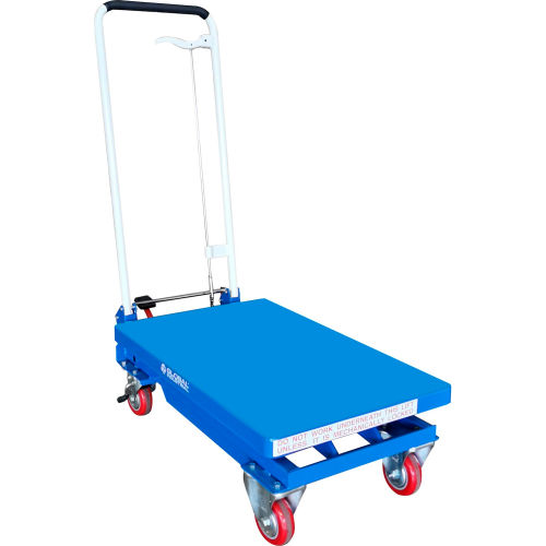 Best Value Mobile Scissor Lift Table with Folding Handle 330 Lb. Capacity - 27 x 17 Platform - BS15 This compact, maneuverable scissor lift is the ergonomically efficient solution to lifting, transporting, and positioning heavy loads. Raise cargo to the perfect lifting height with the foot-operated hydraulic pump. Smoothly lower even heavy loads with the convenient finger release. Added safety from anti-slip rubber handle grips and pedal surfaces. Durable, chip-resistant powder coat finish. Rolls easily on 2 fixed and 2 swivel (with brakes) polyurethane casters. 2 Year Limited Warranty.