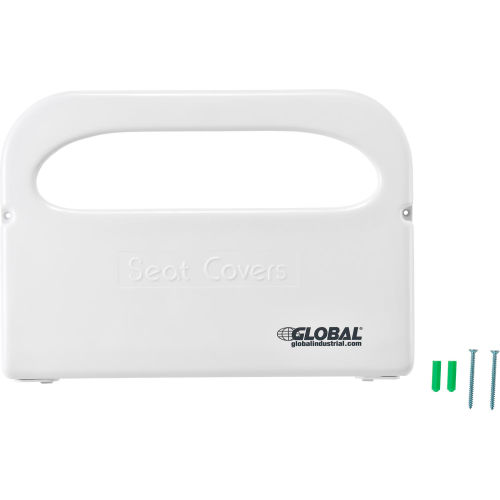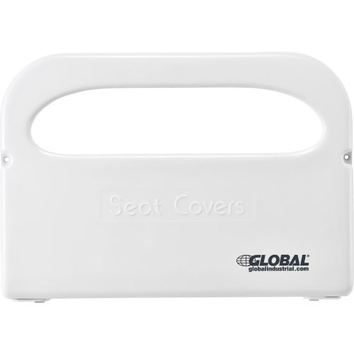 Global Industrial Toilet Seat Cover Dispenser helps provide sanitary seat covers in restrooms. Ideal for use in offices, schools, health care facilities, manufacturing and more. Constructed of durable plastic with a white finish that complements any dcor. For use with half fold toilet seat covers. Holds up to 500 seat covers - one 250 seat cover pack for in-use, and one spare 250 seat cover pack (sold separately). Dimensions: 16"W x 2-1/5"D x 11"H.